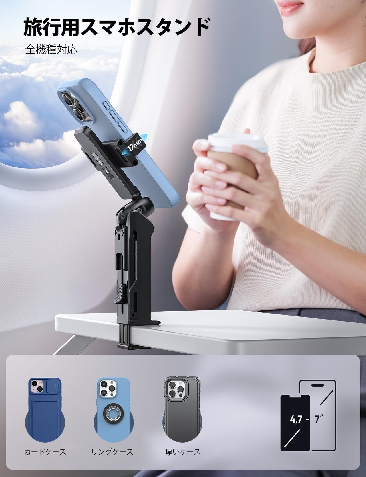 【長時間出行必携・両手解放】出行中にハンズフリーするスマホスタンドを新発売!飛行機のテーブルだけでなく、デスク、滑り止めのパットがあるグリップは安定感が増えるだけではなく、飛行機のテーブルや家具など挟むところを傷からきちんと守ります。長時間の旅に動画/ビデオを見るとき、自分でスマートフォンを持っていると手が疲れがちです。この旅行用スマホホルダーは、外出時に飛行機/新幹線のテーブルに設置して、両手解放することができ、スマートフォンやタブレットを機内で気軽に使えます。飛行機スマホスタンドを使わないときは、スーツケースに挟んでおくと持ち運び便利です。