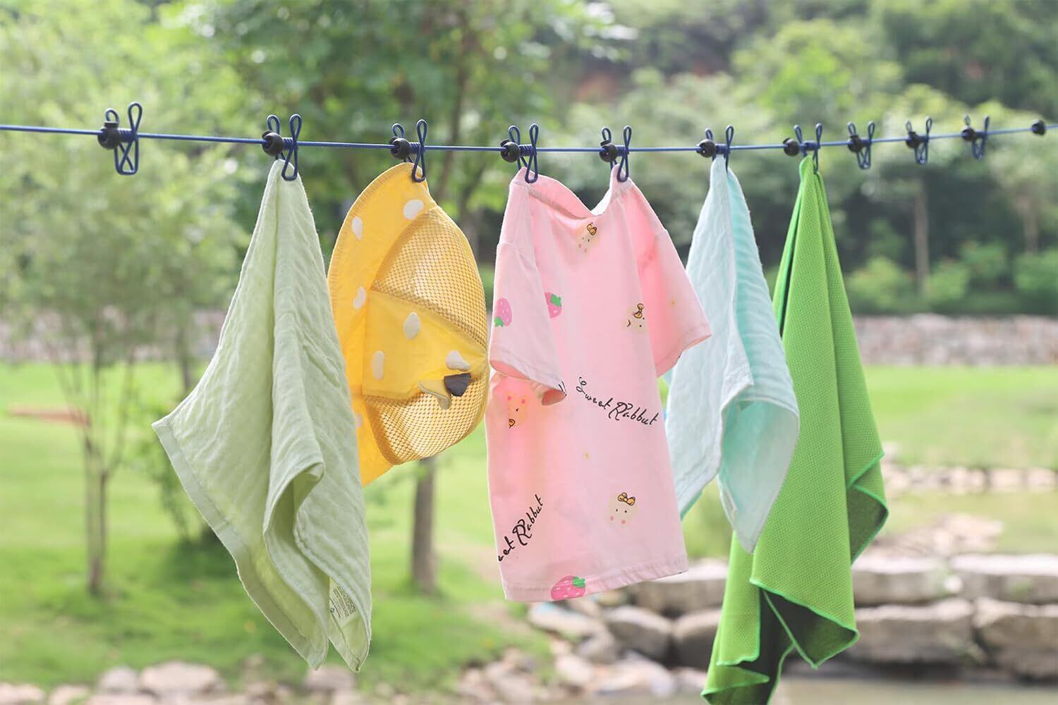 【固定フック】 ラインの端にある2つのフックでどこにでも取り付けることができます:屋外でのキャンプ、2本の木の間、バスルーム、ランドリー、バルコニー、シャワータブの裏庭など。