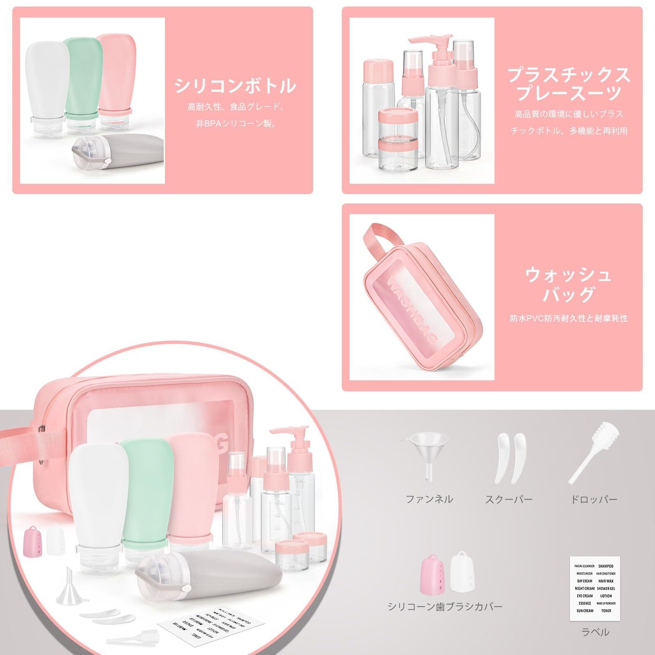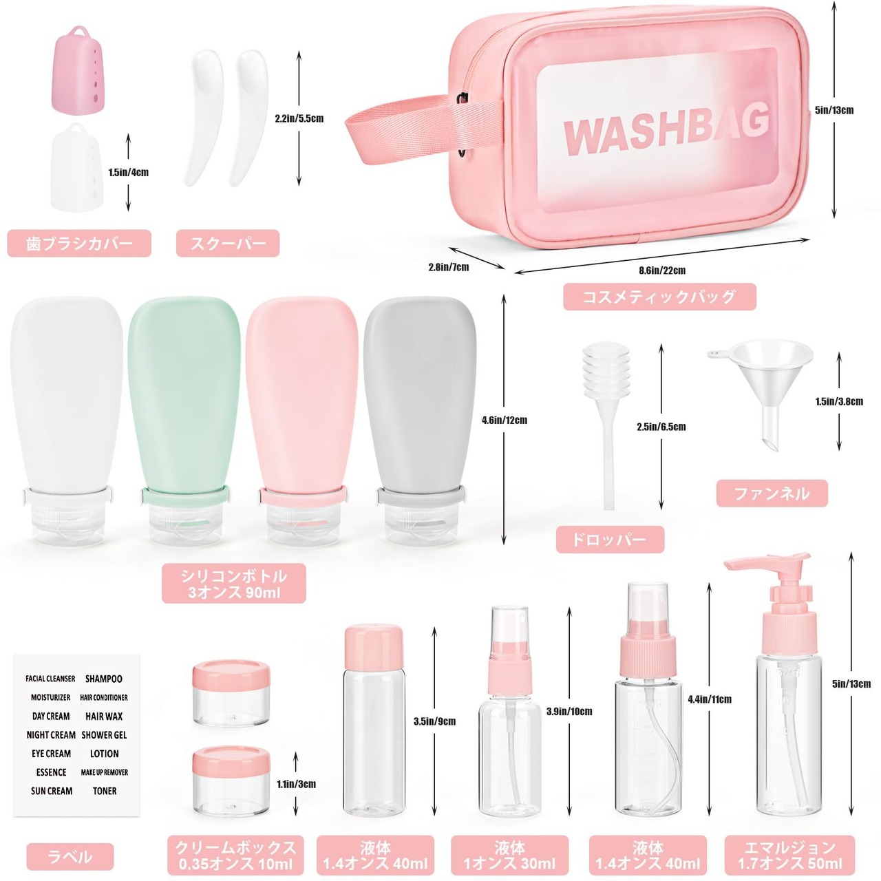 【旅行 シャンプー 容器】: シリコンボトル (3オンス/90ml) x 4、ローションボトル (1.7オンス/50ml) x 1、スプレーボトル (1.4オンス/40ml) x 1、スプレーボトル (1オンス/30ml) x 1、ジャー x 2。 (0.3オンス/10ml)、歯ブラシカバー×2、スプーン×2、漏斗×1、スポイト×1、ラベル×1、バッグ×1、バスアメニティに最適なトラベルボトル。