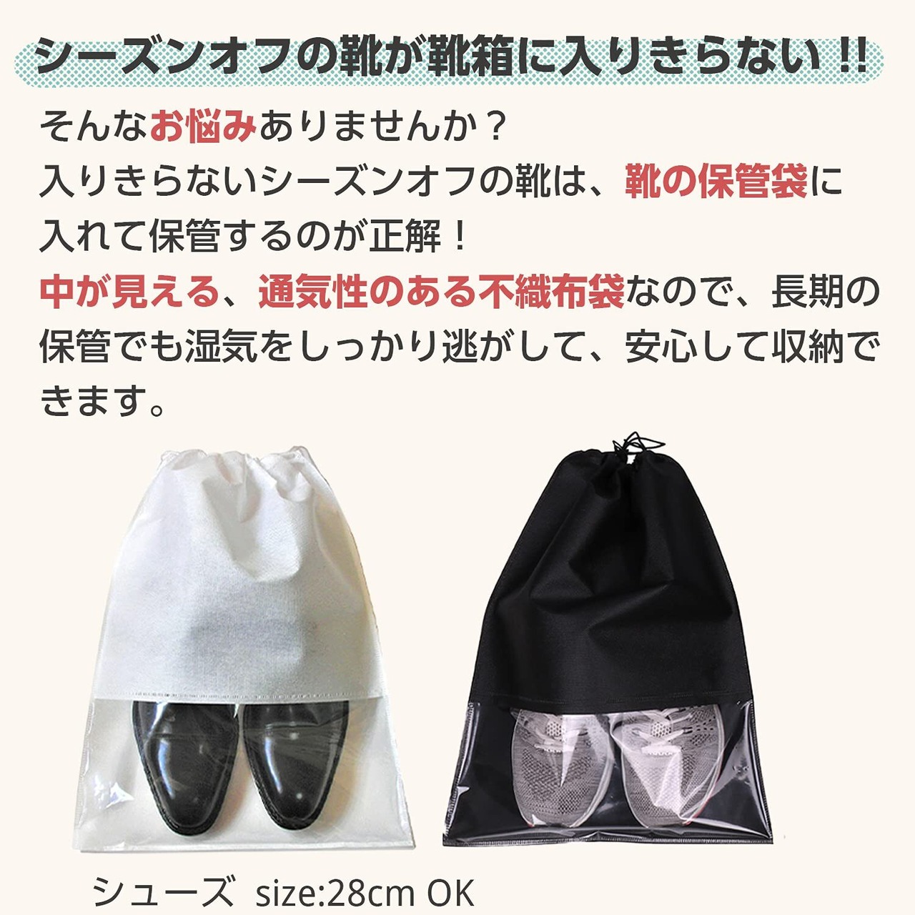 靴が入る巾着袋。通気性があり汚れ防止、ほこり防止におすすめシューズケース。巾着型の保管袋は普段使わない収納ケースとして、箱に入りきらない多くの靴や鞄(カバン)、シャツ、靴下など衣類、雑貨、宝石入れ、本、雑誌などクローゼットにしまう際に汚れから守り保護します。ご家庭でお使いいただくだけでなくビジネス用、出張、旅行、冠婚葬祭、スポーツジム、キャンプなどさまざまなシーンで持ち運び、保管に役に立つ便利グッズ。巾着袋タイプが嬉しい!しっかりめの不織布を使った収納ケース。