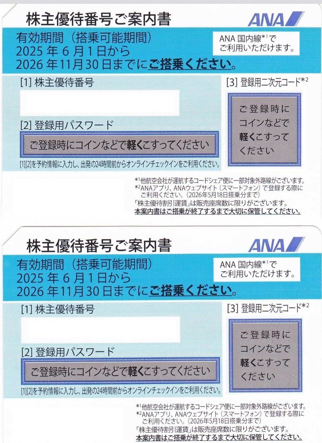 【2025最新】ANA全日空 株主優待券 2026年11月30日まで有効 (2枚)
