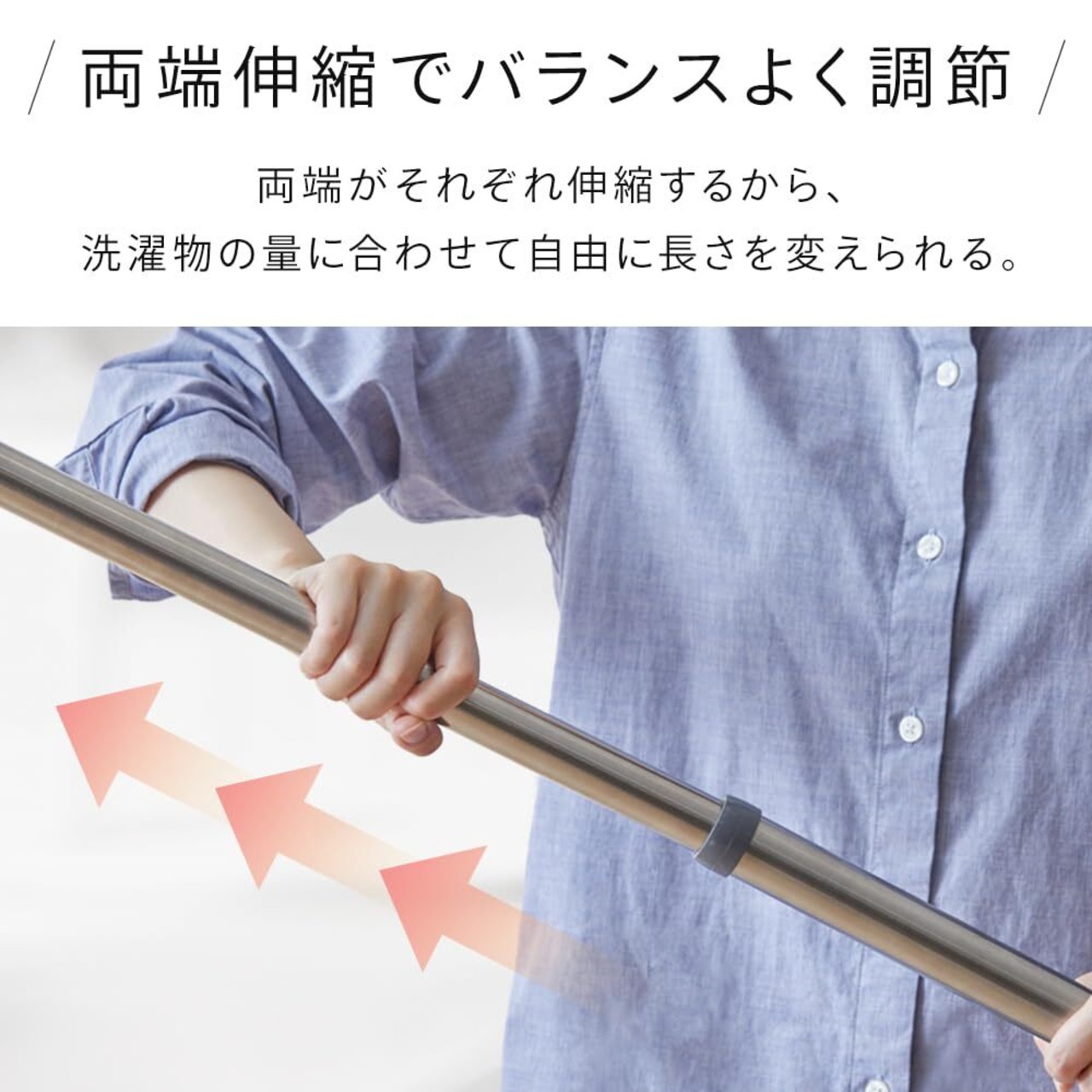 両端伸縮でバランスよく調整。両端がそれぞれ伸縮するから、洗濯物の量に合わせて自由に長さを変えられる。