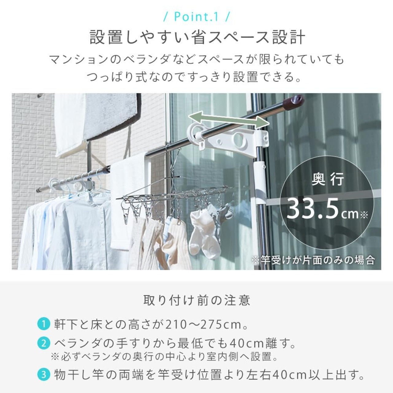 ◆丈夫でサビにくいステンレス巻きスチールパイプ仕様 ◆面接地で天井にしっかり密着する安全設計 ネジやクギが不要なので、簡単に取り付けることができます。 ◆圧着板にバネを追加することでパイプの突っ張り度を強化 竿受けの高さ約や方向を自由に調整可能 ◆パイプ接合部のプラスチックのキャップでたわみ発生を防ぐ。 竿落下防止ストッパー付 ※天井面がボード等やわらかい材質の場合、 必ず芯材のある位置へ取り付けて下さい。 芯材がない位置へ設置すると天井が破損する恐れがあります。 (干す量の目安)シャツ等15枚、バスタオル5枚、タオル5枚、小物24枚