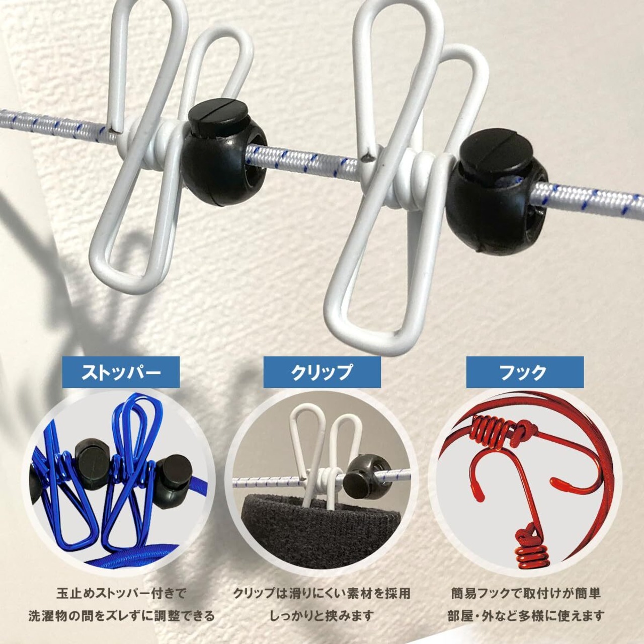 【商品詳細】長さ:1.8m(最大2.8m程度まで伸縮可能)。重量:180g。洗濯クリップ:12個。固定ストッパー:13個。素材:ゴム、鉄、ポリプロピレン、PVC。製造国:中国。