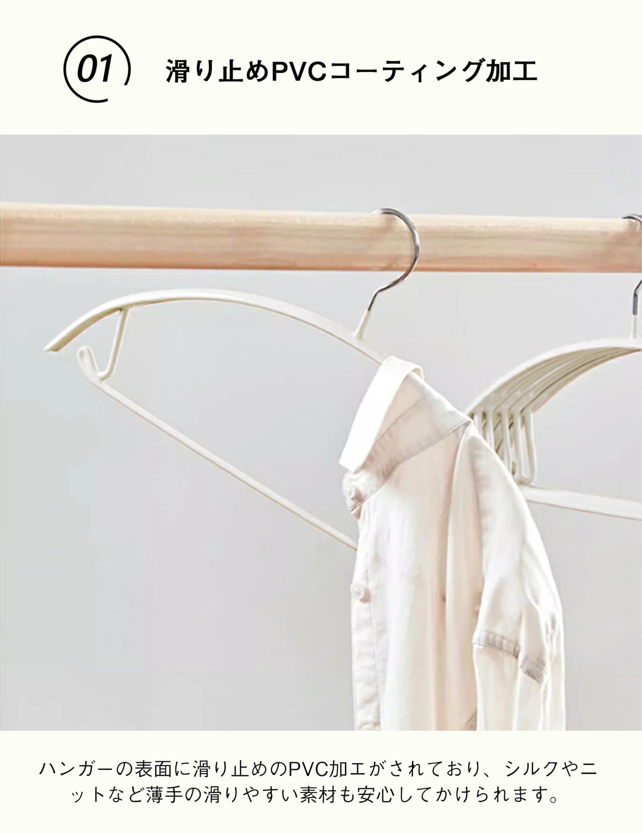 【滑り止め設計で衣類をしっかり固定】ハンガー表面に滑り止めPVC加工を施しており、シルクやニットなどの滑りやすい素材も安心してかけられます。半円形のデザインで肩の型崩れを防止し、衣類の形状をキープします。