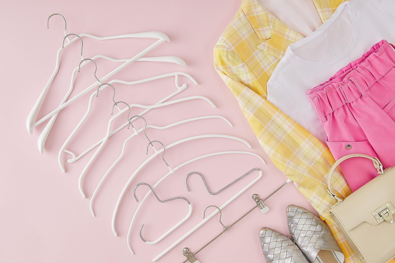 【収納力UP】厚さ1cmのスリムデザインなのでクローゼットやハンガーラックで幅を取らずにたくさんかけられ、省スペース。ハンガーを統一する事で肩のラインが並び、見た目も美しく、スッキリ収納。