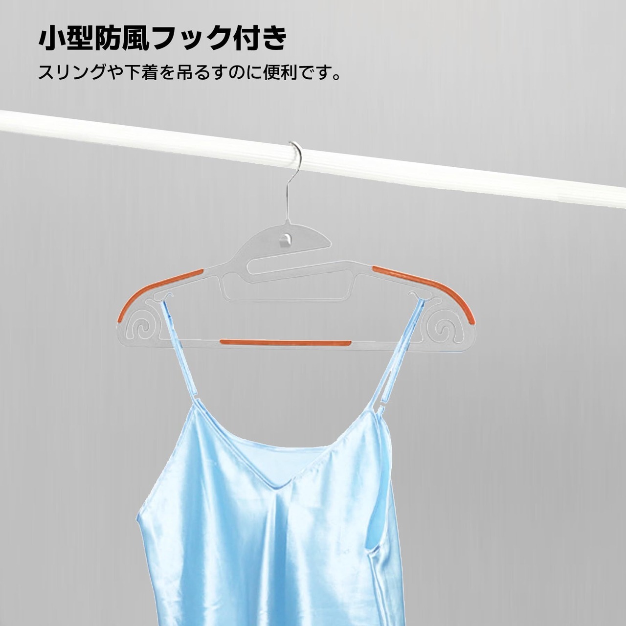 【滑り止め設計】 ハンガーの肩部分には波模様や粒子、摩擦を効果的に高めて滑りを防止します。シルクやシフォンなどの滑りやすい衣類を掛けてもしっかりフィットし、落ちたり型崩れしたりを防ぎます。