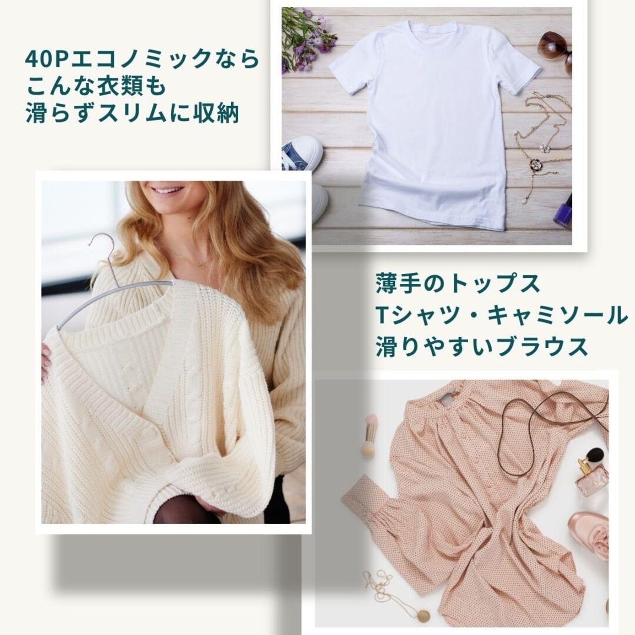 【すべらない】スチール製のハンガー本体はPVC樹脂で特殊コーティングが施され、掛けた衣類が滑り落ちません。人体のラインに合わせた立体構造のため、滑り落ちやすいカーディガンやニットも型崩れなく収納できます。