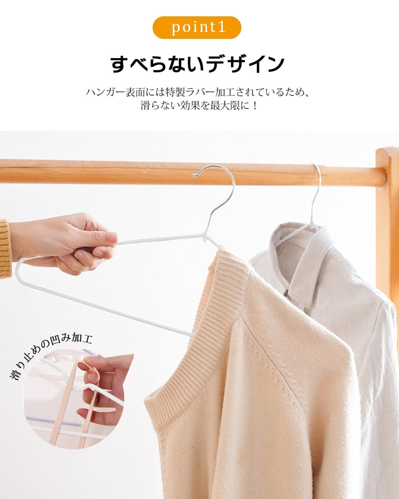 【すべらない】ハンガー本体はPVC樹脂で特殊コーティングが施され、掛けた衣類が滑り落ちません。人体のラインに合わせた立体構造のため、滑り落ちやすいカーディガンやニットも型崩れなく収納できます。窪みもあるので、下着やキャミソールやスカート等にも幅広く活用いただけます