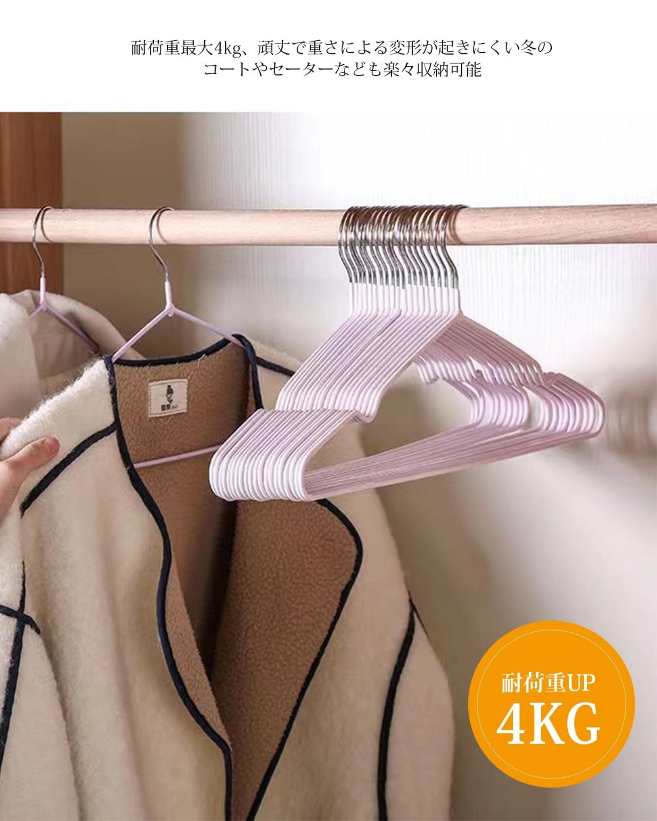 【商品詳細】[サイズ]幅40.0×高さ20.0×厚み0.3cm [重量]約40g/1本 [材質]スチール+PVC加工 [セット内容] 20本組 耐荷重4kg ハンガー本体は高品質のPVC素材とスチールで作られています
