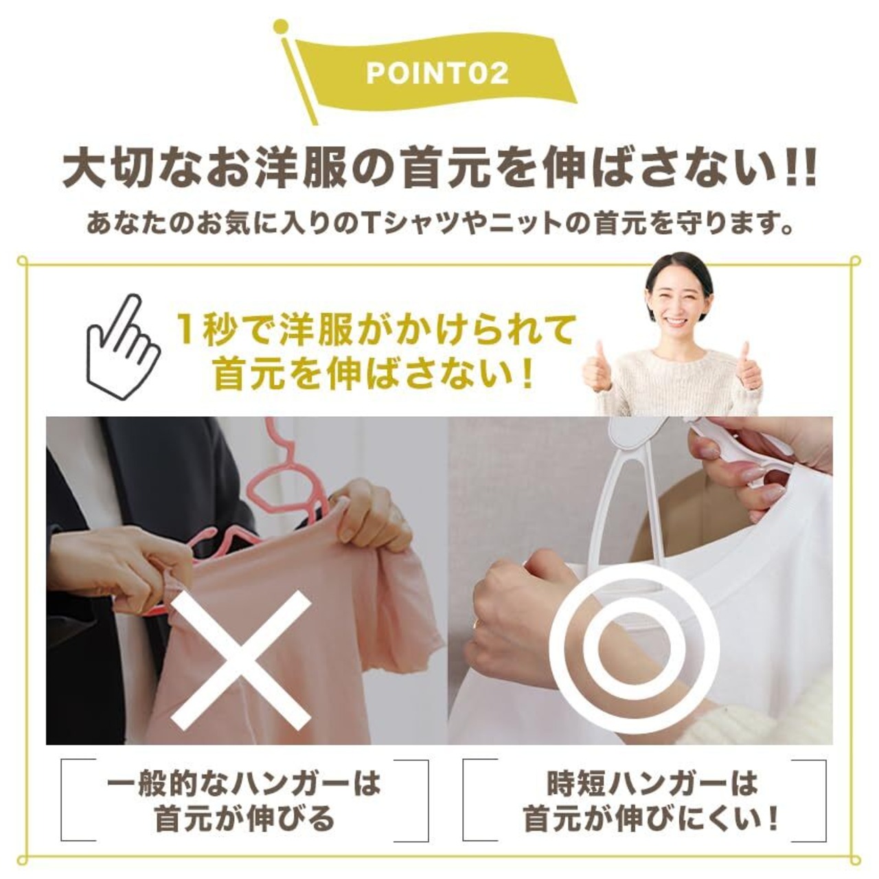 【国際中!1秒着脱&洋服ケアが叶うハンガー】 「もう、首元を伸ばさないようにハンガーを服の中に通す必要はありません!」 Tシャツやセーター、デリケートなブラウスなど、首元の狭い洋服も、レバーを握るだけのワンタッチ操作でハンガーが折り畳まれ、首元からスッと差し込めます。大切な衣類を傷めることなく、型崩れを防ぎます 。 毎日の洗濯物干しやクローゼットへの収納時間を大幅に短縮し、「超時短」を実現。忙しい日々の家事を劇的に効率化します 。