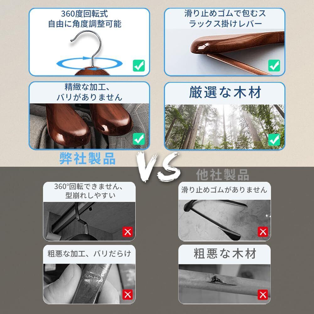 【360度回転フック、サビ防止】木製ハンガーのフック部分は360 Degree回転するので、角度を自由に調整できます。アイロンをかけるときは、ハンガーから衣類を取り出す手間をかけずに回転できるのでとても利便性。さらに、このハンガーのフックはクロームメッキで錆びにくく、利便性性に優れているだけでなく、非常に便利です。