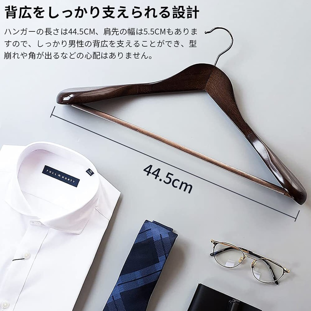 【スーツのパートナー】当木製ハンガーはジャケットとスラックス、ネクタイを一緒にかけられるため、余分なスペースを取ることがありません。肩掛けラインの角度は人に肩に近い形状に設計することで、衣類の型崩れが防止できます。バーの部分には滑り止めシリコンがついていますので、ハンガーからスラックスが滑り落ちることはありません。