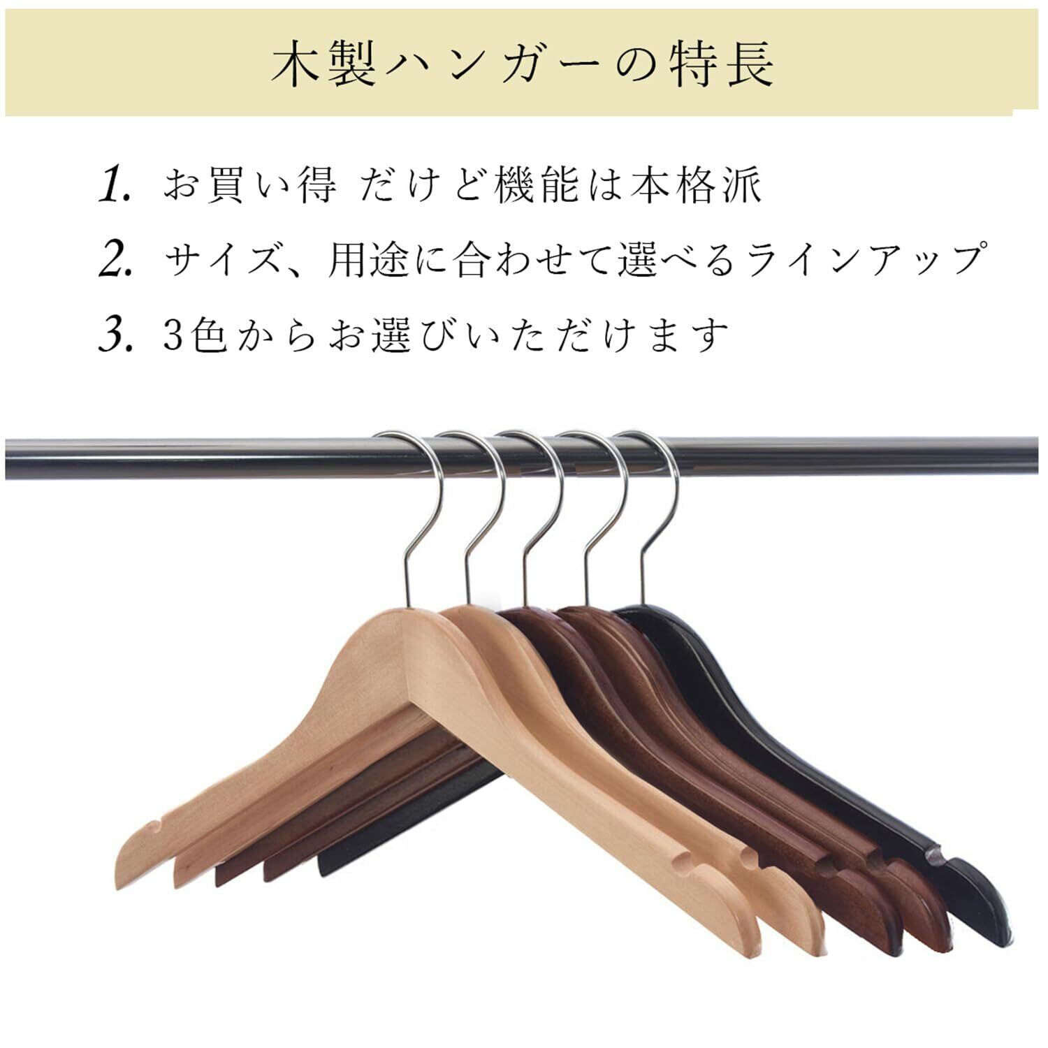 【高品質】徹底した品質管理を行い、高品質で上質な天然木によって作られた木製ハンガー。木材の割れやバリや光沢の剥げなどの不良点の有無の細かくチェックして不良品を極力排除しております。味わい深い雰囲気でクローゼットに統一感を生むダークブラウン塗装の木製ハンガー。