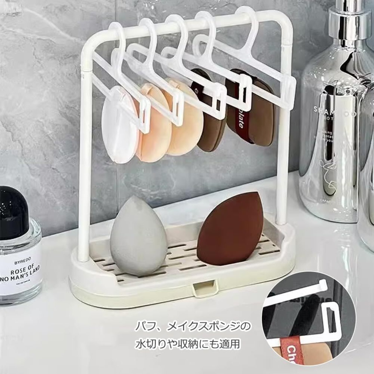 パフ、メイクスポンジの水切り、干しや収納にも適用。