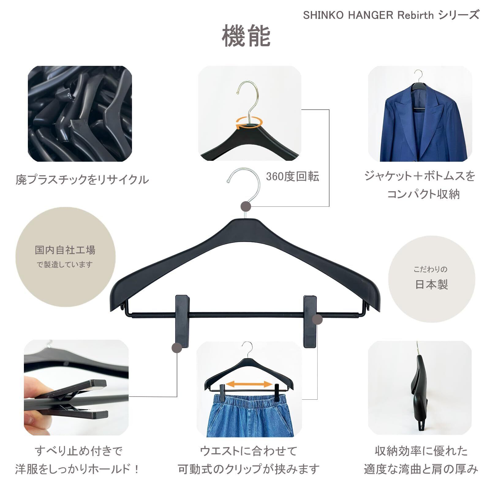 【特別価格】シンコハンガー(Shinkohanger) ベーシックスーツハンガー リバースジャケットスリムクリップ42 ブラック 日本製 360度回転フック付き スカート ピンチ付 コート アウター かたくずれ防止 滑り止め付 すべりどめ スラックス コート リユース 再生 SDGs 053683