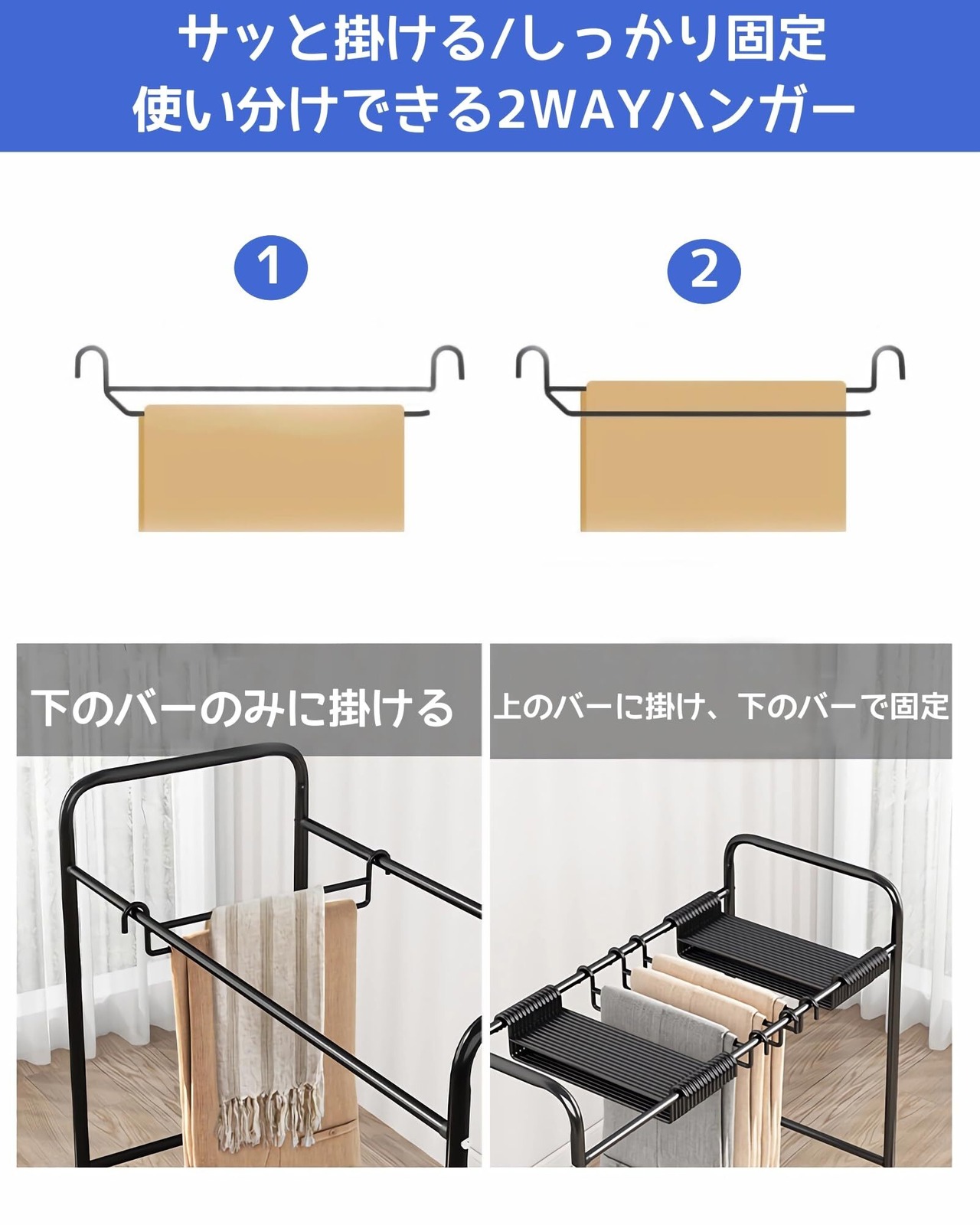 【衣服の出し入れが簡単】ズボンラックには付属品が付属しており、簡単に組み立てられます。ハンガーは取り外し可能。本体の両端のパイプに引っ掛けるだけだから、すぐに取り出せて収納するときも 簡単に本体に引っ掛けることができます。 ズボンをかけたハンガーを上から引っ掛けるだけの簡単収納。