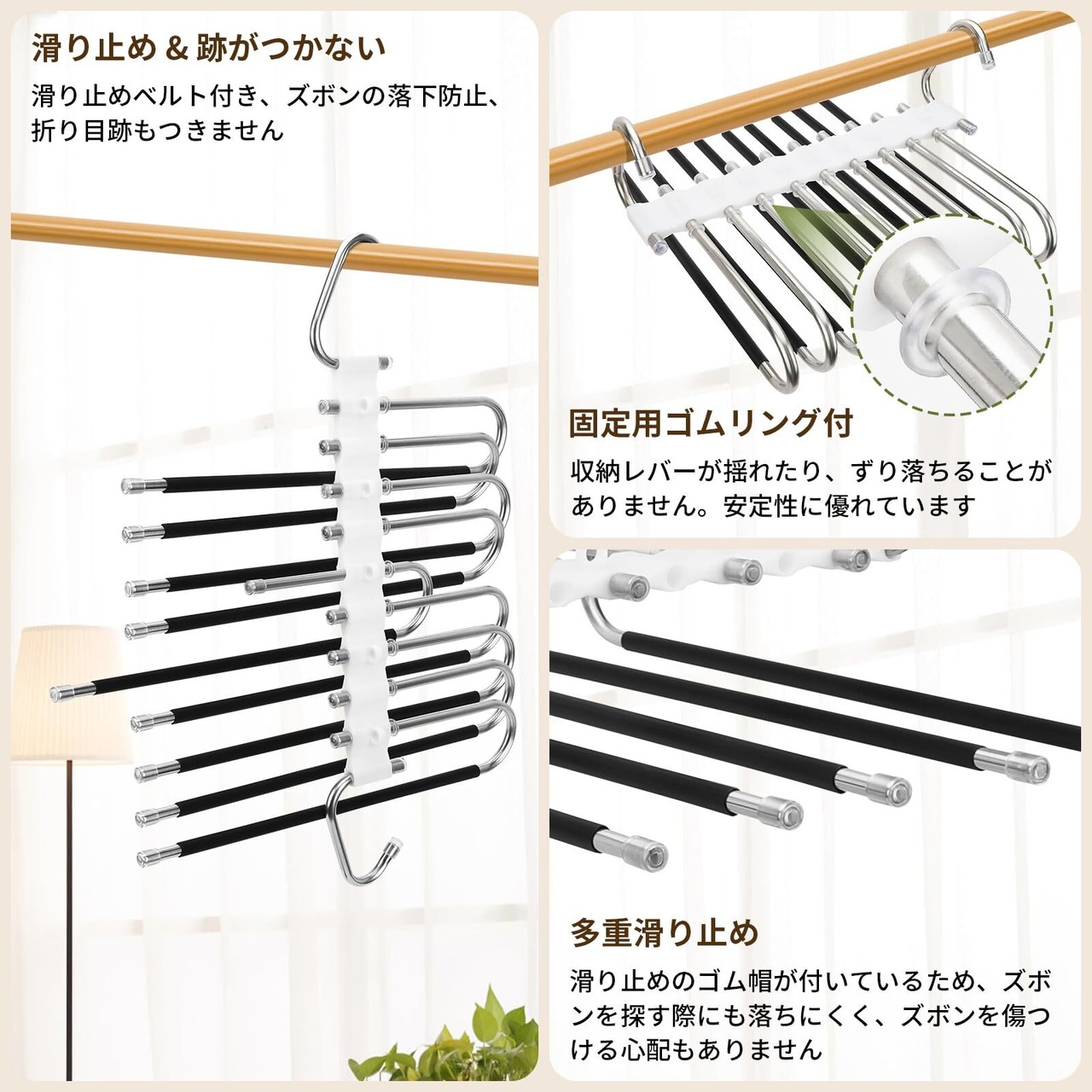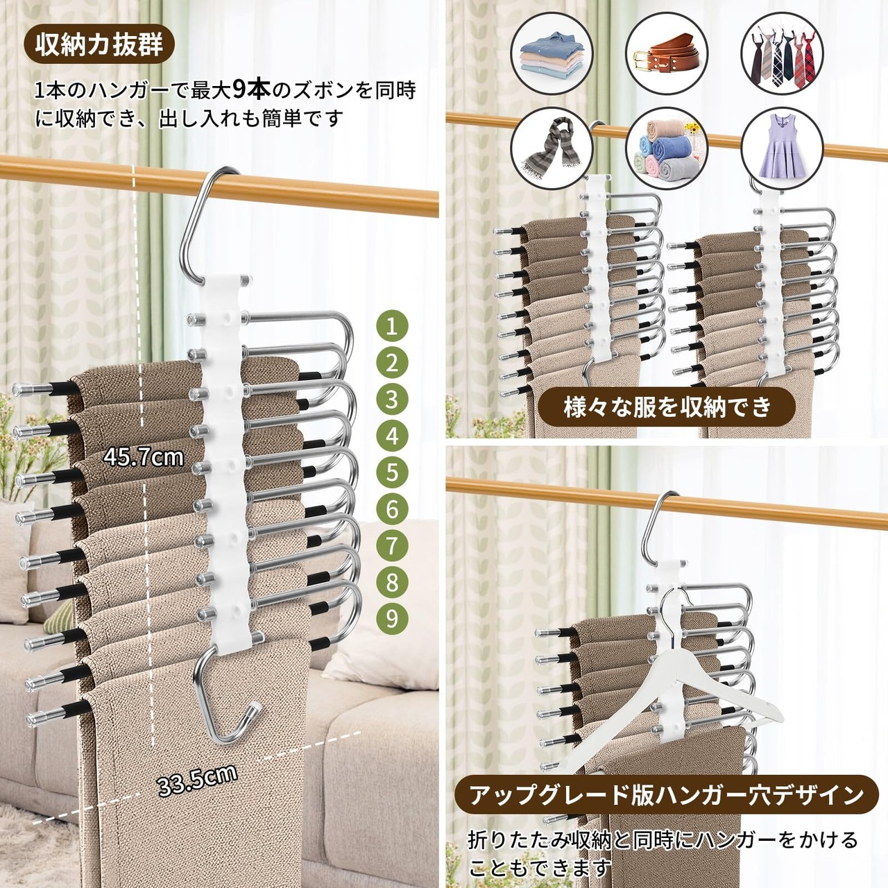 【在庫限り】ズボンハンガー スラックスハンガー 2本セット 折りたたみ可能 9段 収納ハンガー デニム ロングスカートハンガー ステンレス 荷重力 乾湿両用 滑り止め 省スペース 収納カ 跡がつかない 皺防止 180°回転フック ハンガー穴付き (9段-2本セット)