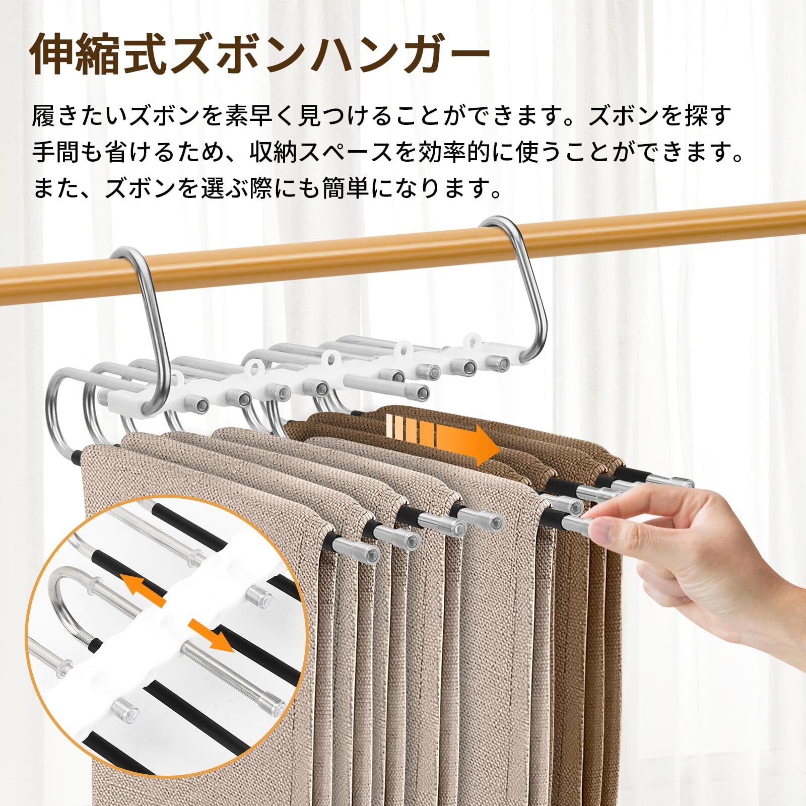 【伸縮式ズボンハンガー】履きたいズボンを素早く見つけることができます。ズボンを探す手間も省けるため、収納スペースを効率的に使うことができます。また、ズボンを選ぶ際にも簡単になります。