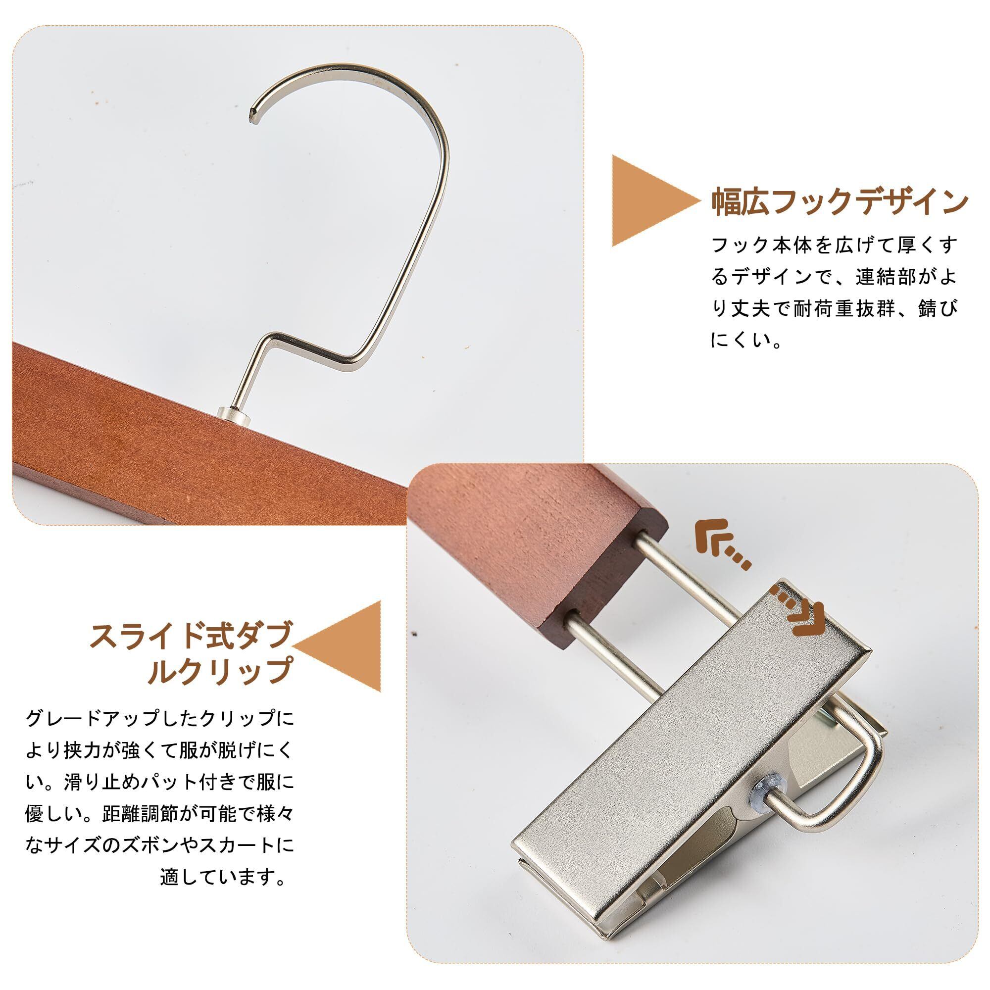 【すべ落ちない】:ボトムやスカート、マフラーなどに最適な、クリップで挟むタイプの木製ハンガー です。ステンレスてつ製のフックはご都合によってできます。また、耐久性と滑り落ちない機能性を兼 ね備えています。