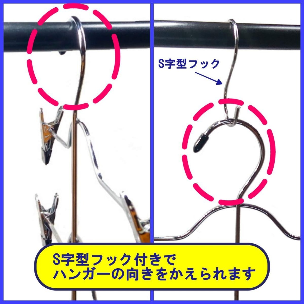 スカートやズボン、スラックスをクリップで挟むだけで、シワや型崩れから防いでたくさん収納できる、とても重宝するスカートハンガーです。 また、最初からS型フック付きなので、省スペースハンガーの方向を変えて吊るすことが出来てとても便利に使うことができます。