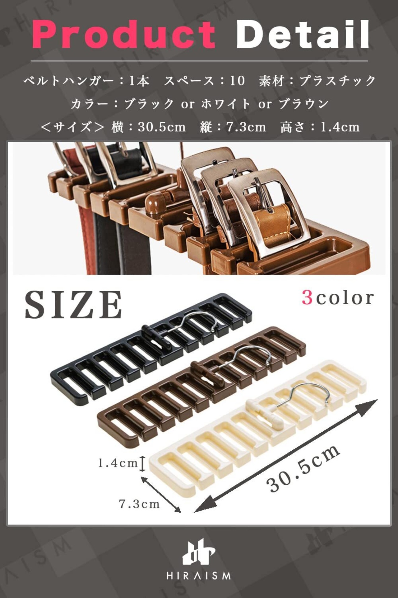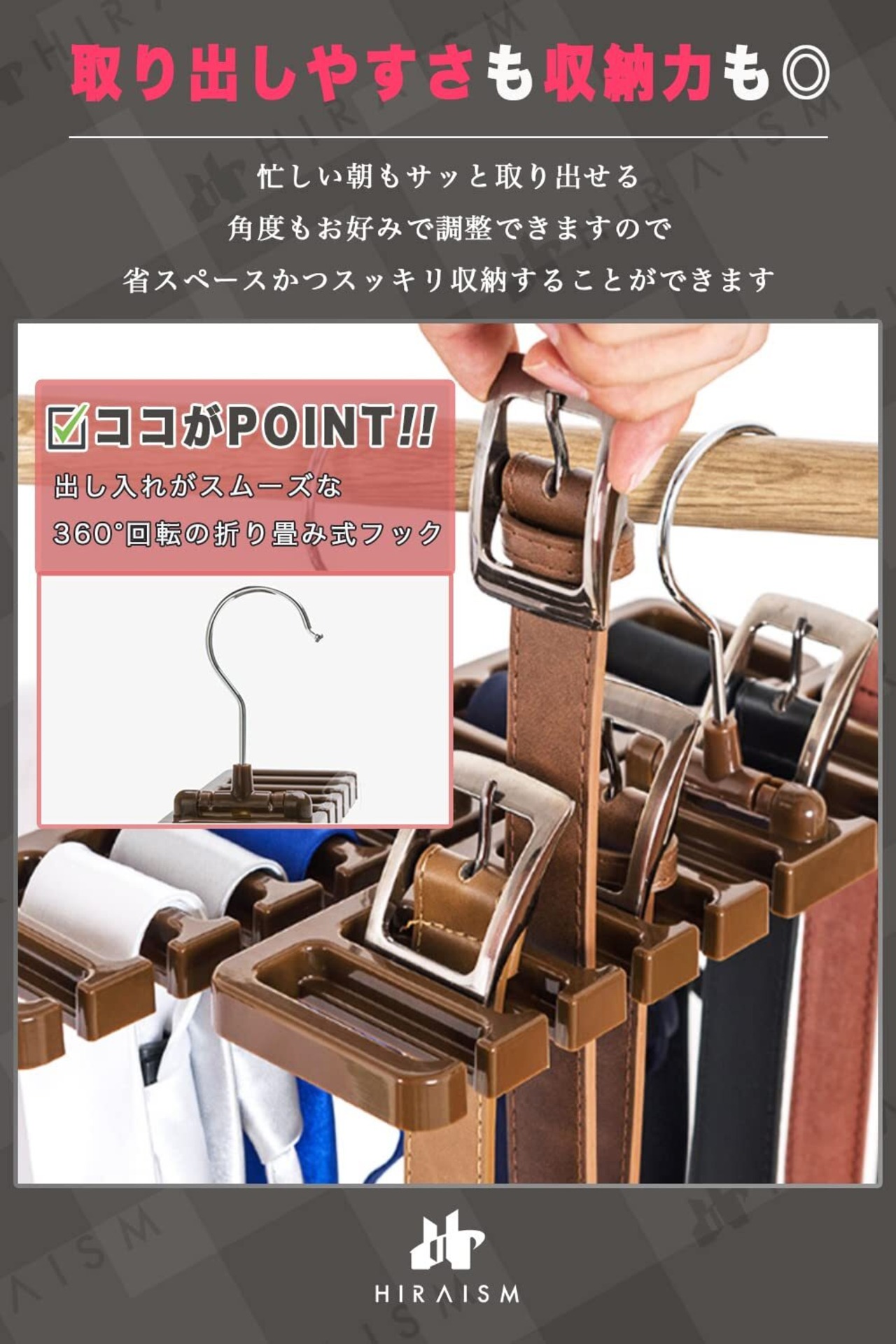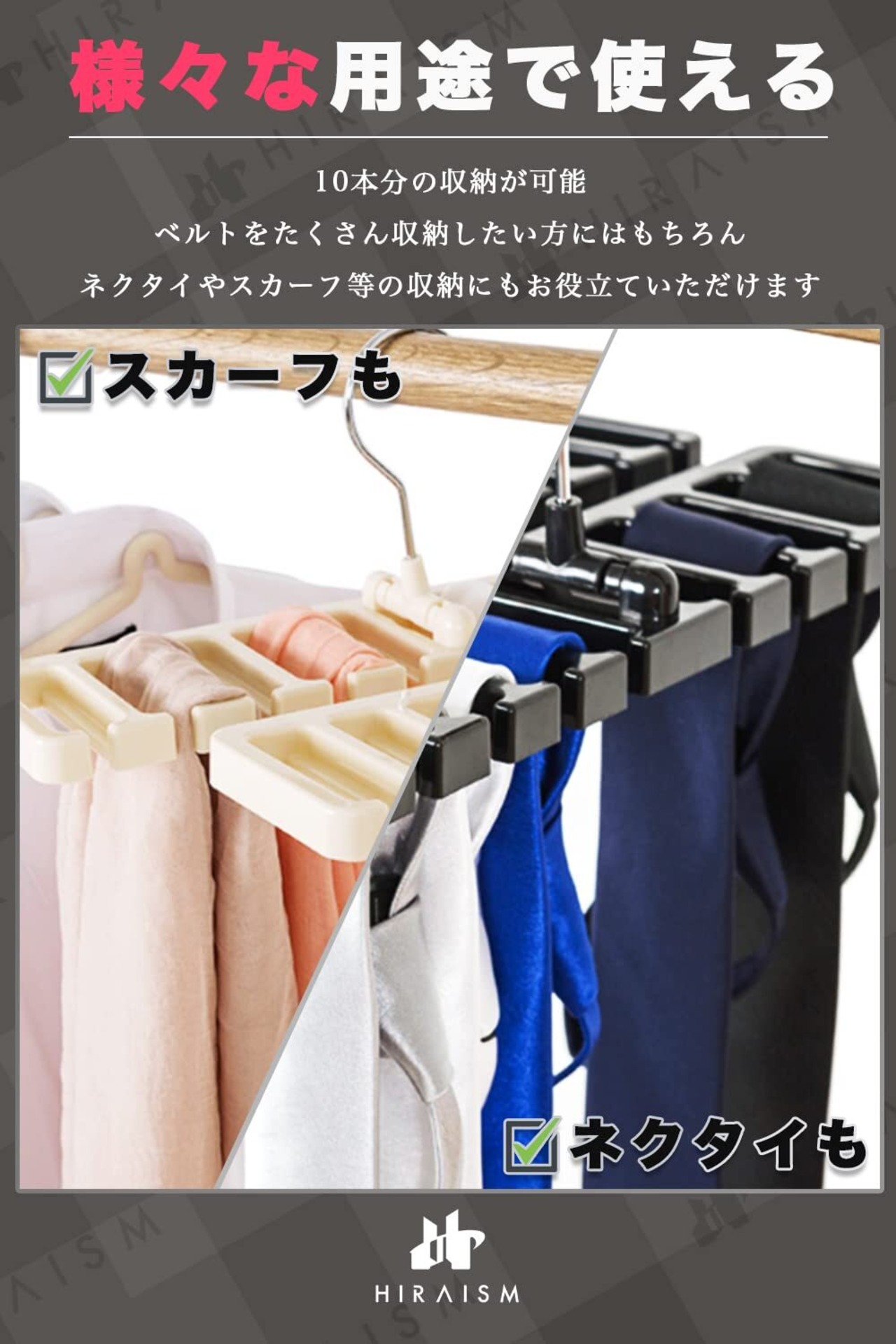 HIRAISM ベルトハンガー ネクタイハンガー おしゃれ 10本 収納 (ブラック, 1)