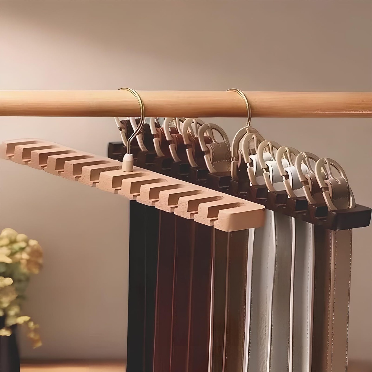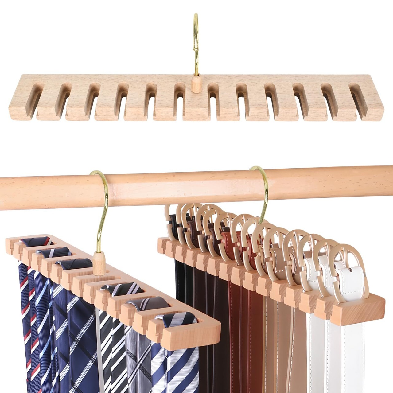 ブナ材で作られたベルトハンガー、ハンガー 収納 ネクタイハンガーすべり落ちないネクタイラック たっぷりネクタイ 収納 回転 下着収納 ベルト整理、コンパートメントを備えた省スペースの木製ベルトフック、ベルト/スカーフ/ネクタイ用のワードローブ収納