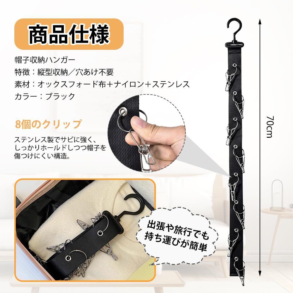 省スペースでスッキリ収納!最大8個の帽子を型崩れせずに収納できる、縦型ハンガーのご紹介です。全長約70cmの本体に、サビに強いステンレス製クリップが8個付属し、帽子だけでなくスカーフやネクタイなどの小物収納にも対応。360度回転する上部フックで、クローゼット、ドア、壁など設置場所を自由に調整可能。おしゃれと実用性を兼ね備えた、省スペースに最適な収納アイテムです。カラーはブラック、便利なステッカー付き!