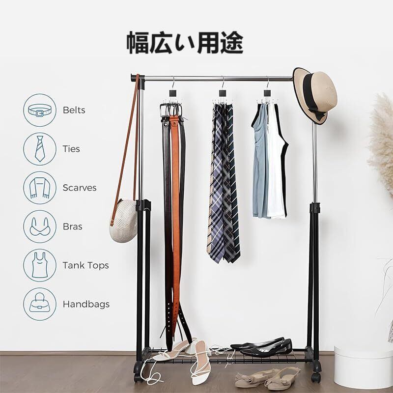 【回転可能の設計】360度回転フックなので、各爪の位置と角度を調整して、ハングと取りやすくて、アイテムに簡単にアクセスでき、衣類、バッグ、タオル、シャワーカーテンなど、あらゆる環境でさまざまなアイテムを掛けるのに適しています。忙しい時でも、ネクタイやベルト選びに困りません。