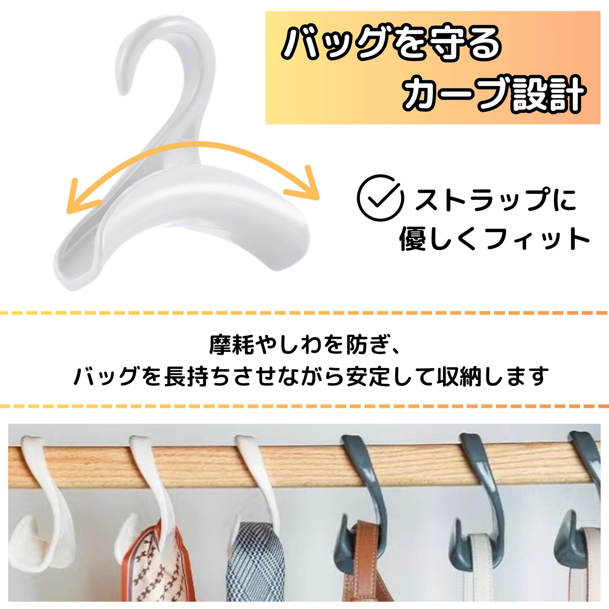 【バッグを守るデザイン】 East Leafのバッグハンガーは、カーブ設計でストラップに優しくフィット。摩耗やしわを防ぎ、バッグを長持ちさせながら安定して収納します。
