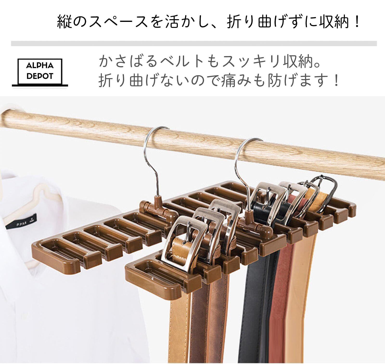 ベルトをキレイに整理:かさばるベルトをスッキリと整理整頓。折り曲げずに掛けるだけで、傷みを防いでキレイに収納できます。