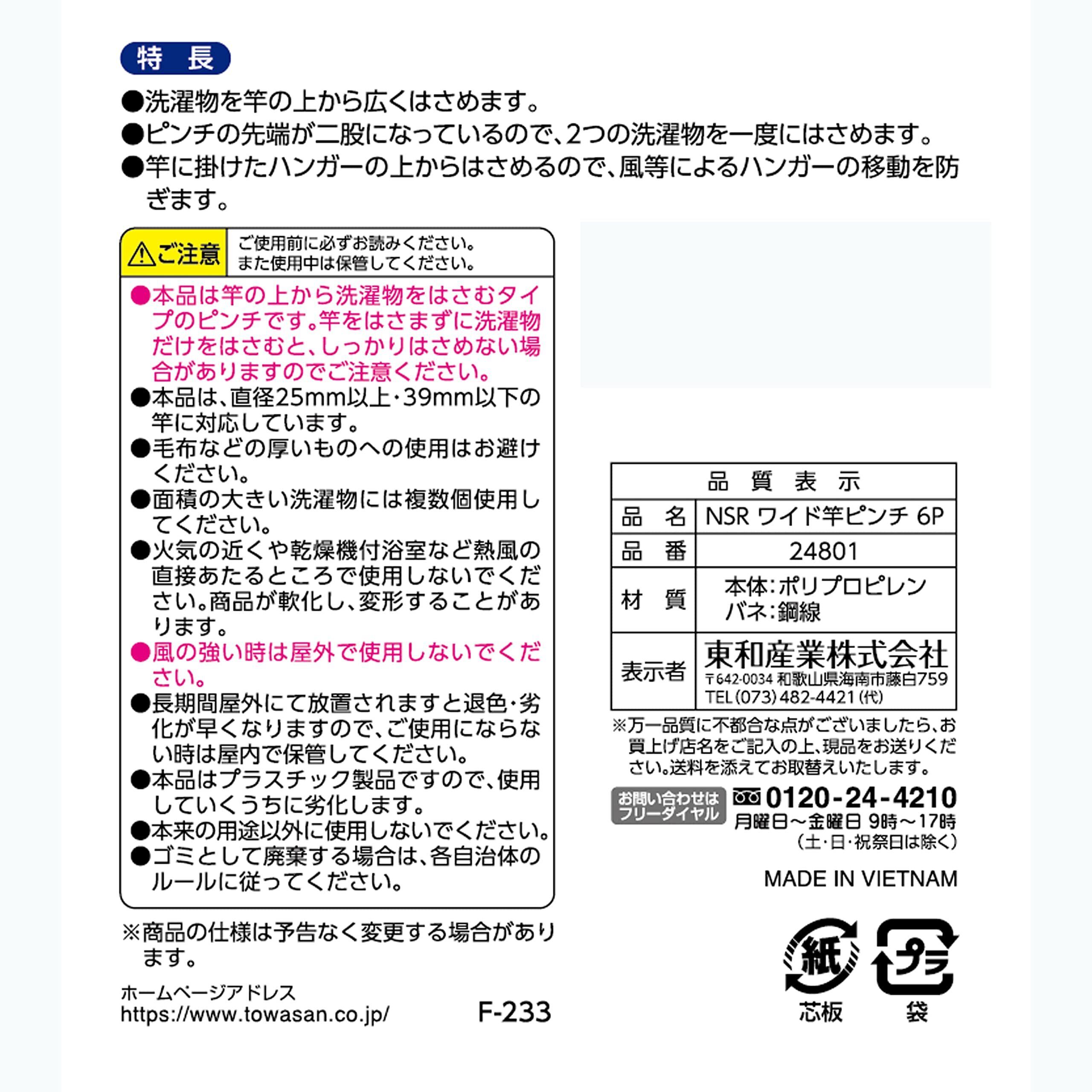 【特価セール】東和産業 洗濯バサミ ネオスール ワイド竿ピンチ ホワイト・ブルー 約4.4×3.4×9cm 6個入
