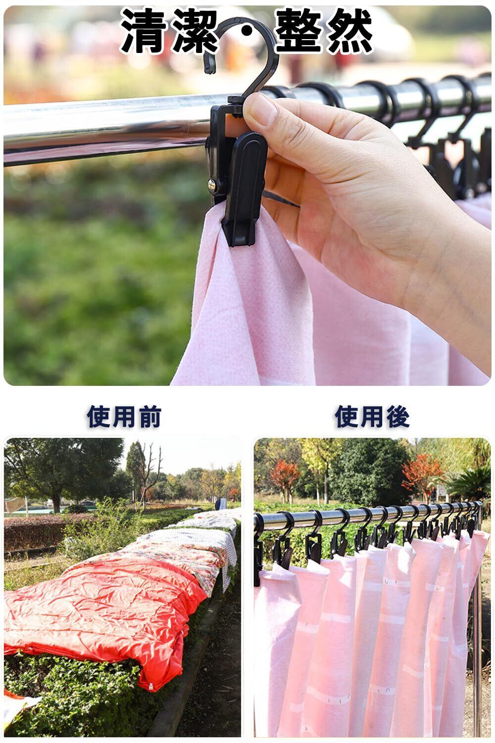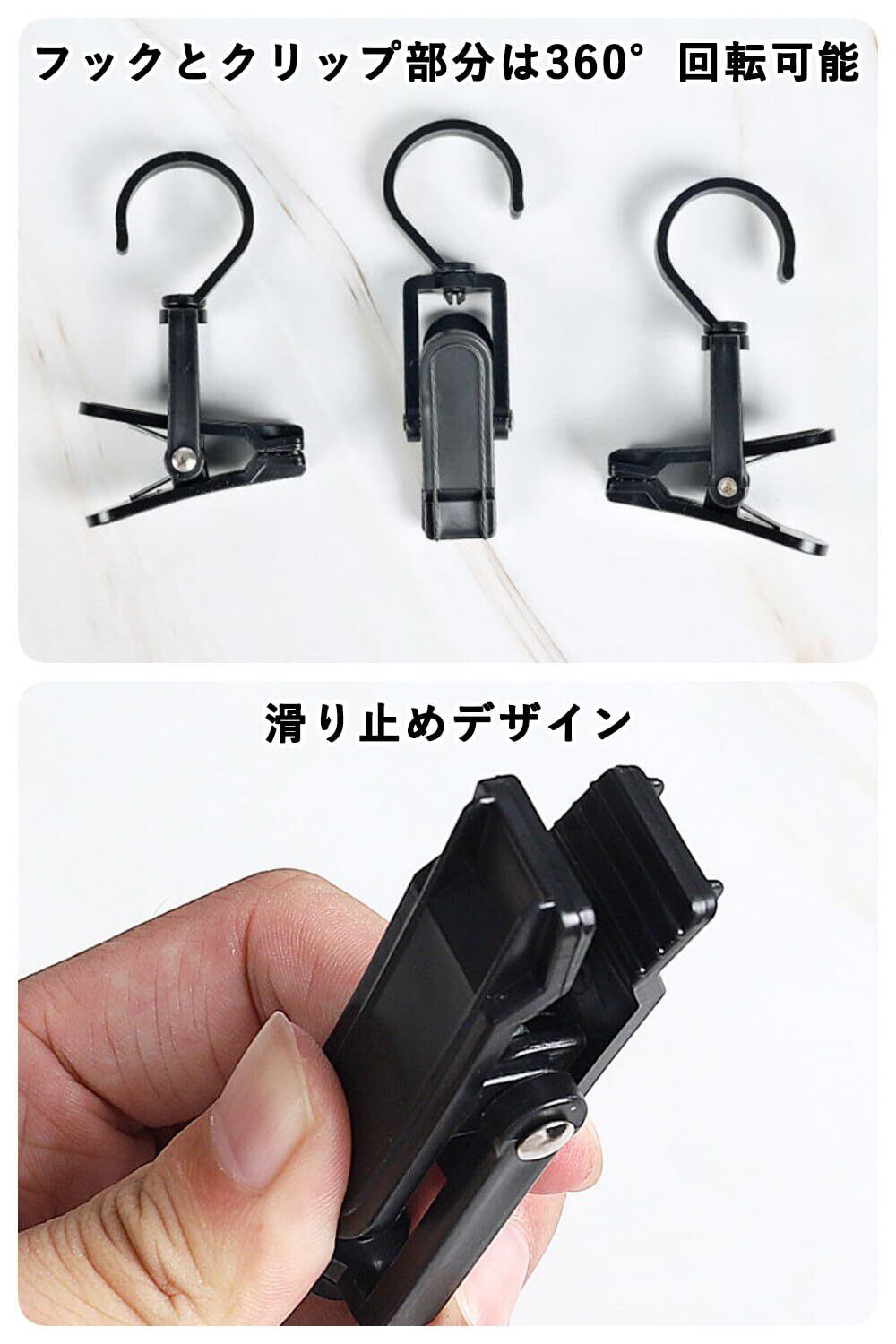 【デザイン】フックとクリップ部分は360°回転できるので、柔軟で便利。内部グリップの歯のデザイン、服は簡単に脱落しません。