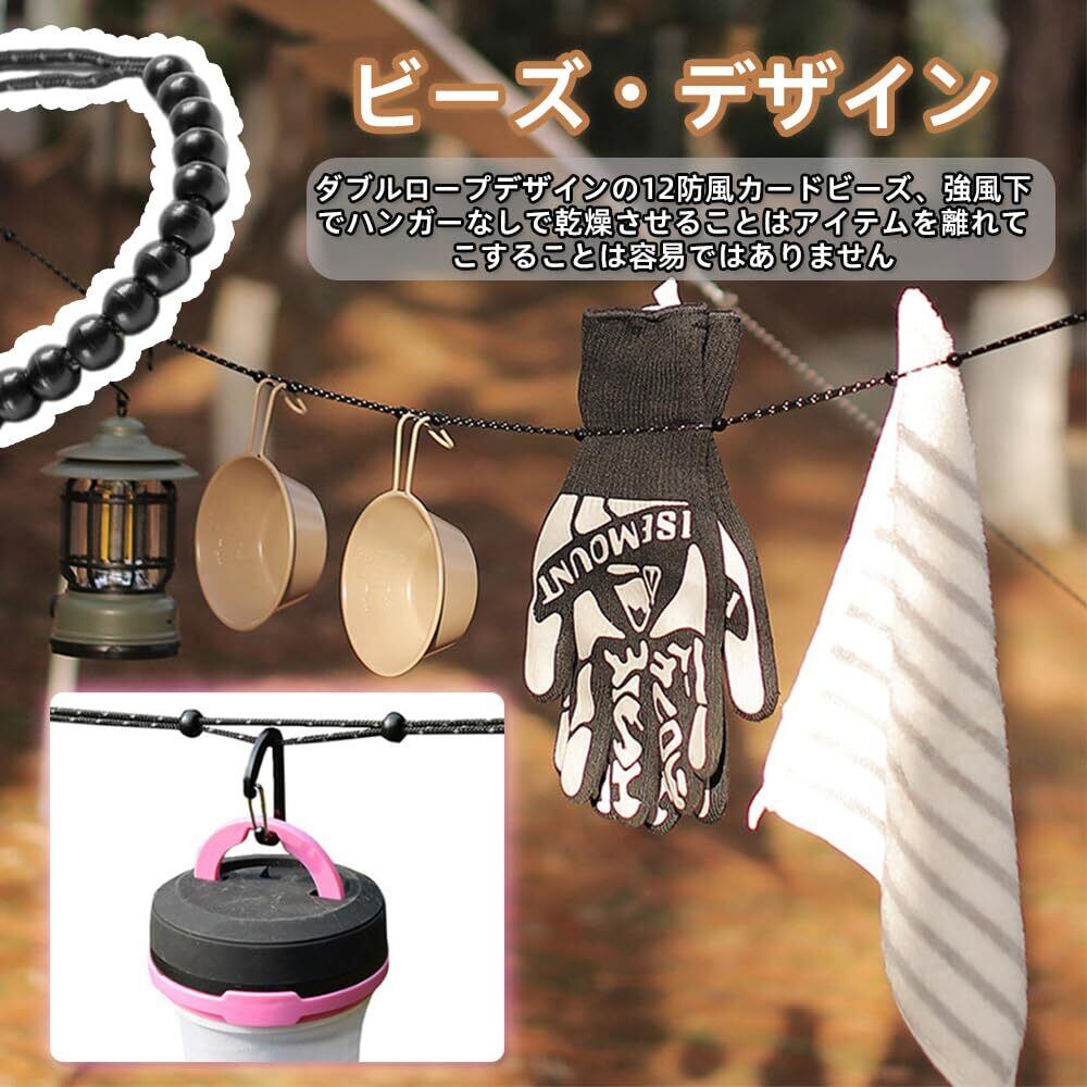 【多機能で幅広い用途】タオルや衣類はもちろん、キャンプ用品やその他のアイテムを干すのにも適しています。旅行先、バルコニー、キャンプ地など、さまざまな場面で活躍するこのロープは、アウトドア愛好者や旅行好きには欠かせないアイテムです。