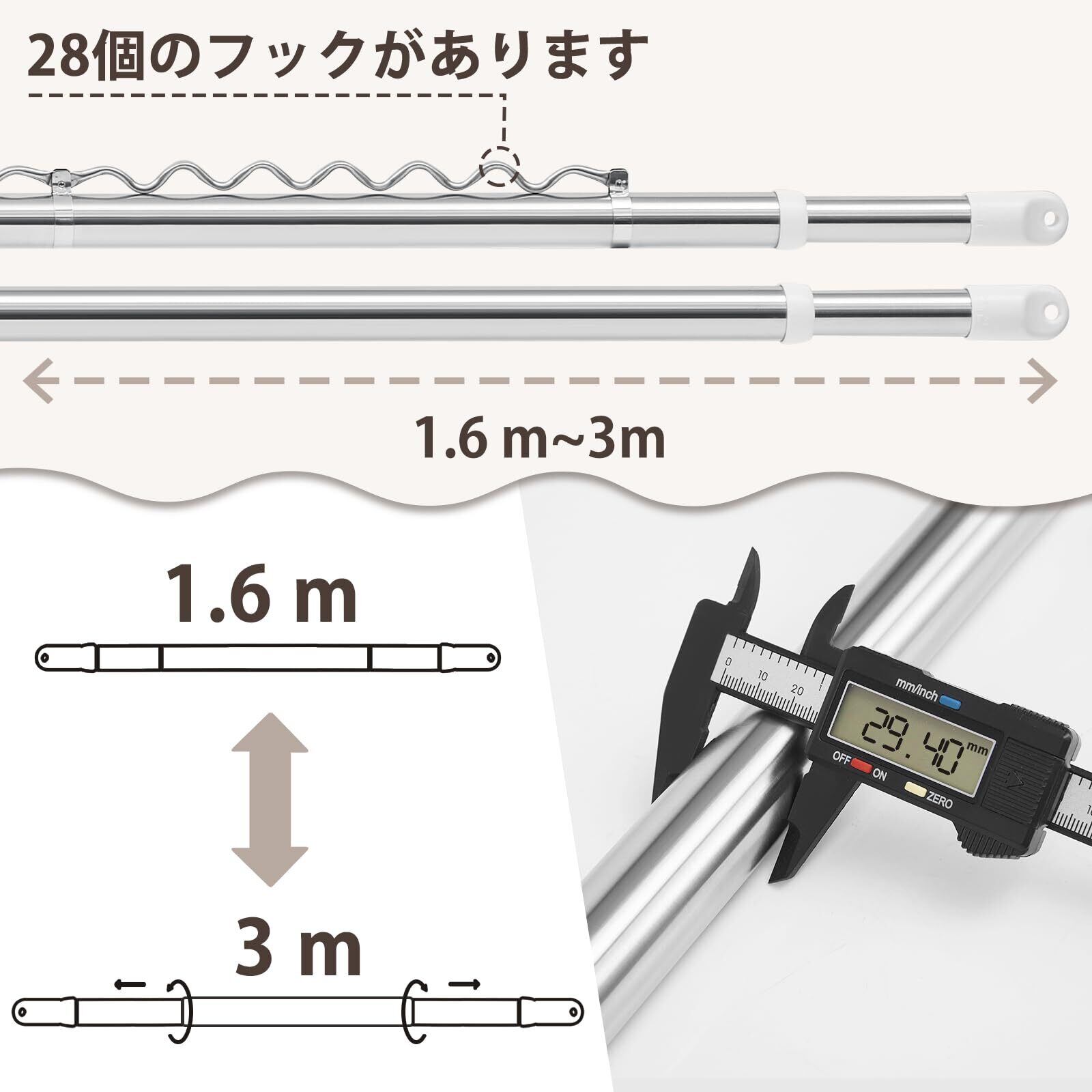 *強力な物干し竿:ものほし竿のパイプ径:外直径29mm 内直径25mm、鋼管の厚さは6 mmで、内容: ハンガーかけ付竿×1本 3M ,28個のステンレス製フックを組み立てる,一般の物干し棒と比べ、より頑丈、型崩れもしにくく、最大耐荷重は50kg