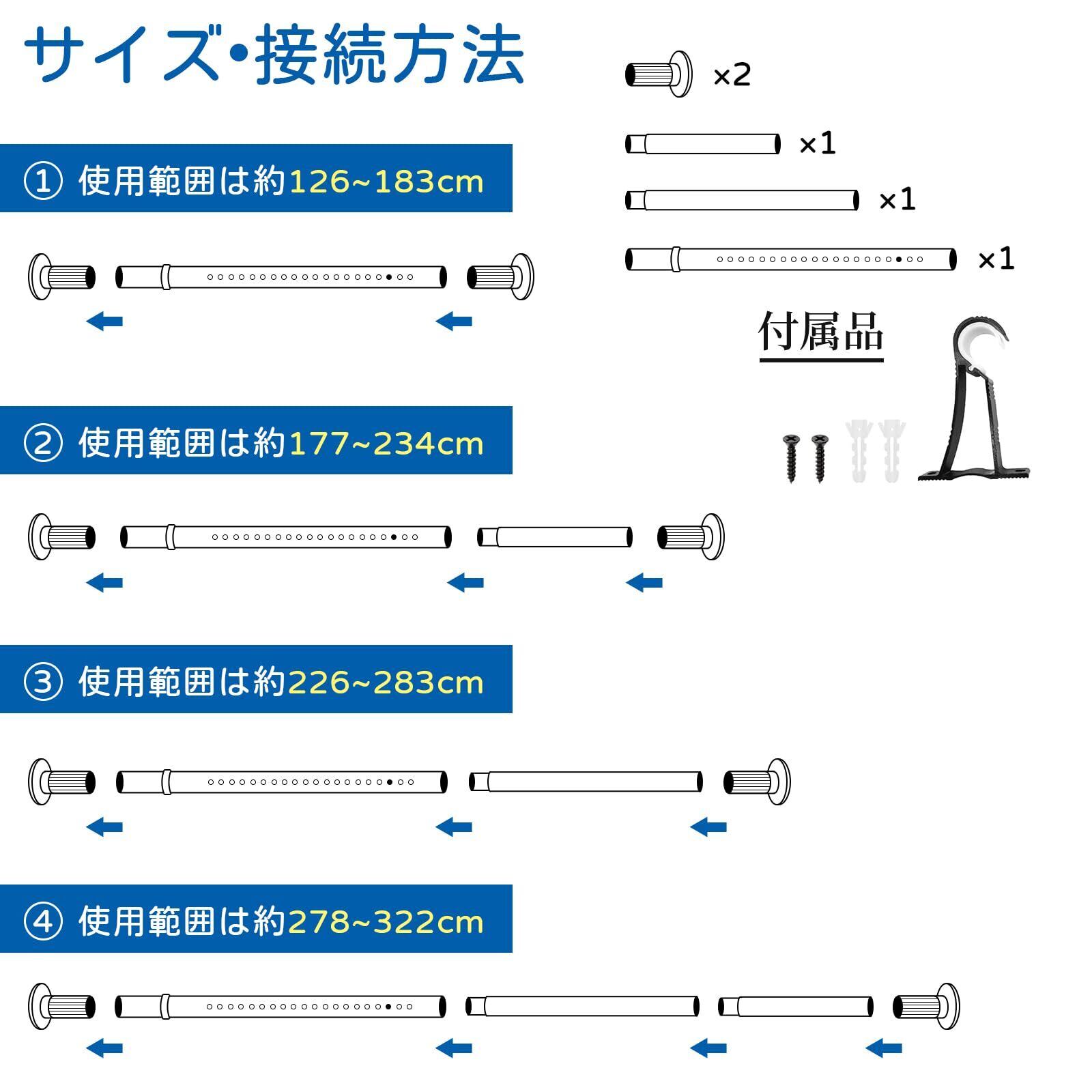 【長さ調節自由▪超強力突っ張り棒】つっぱり棒に强力ばねを内蔵して、耐荷重が10~30kgで、取り付け幅は130~320cmとなります。接着面が滑り止めゴムとハニカム構造で、摩擦力が高く、長く伸ばしてもズレ落ちる心配がありません。※更に吊り下がるフック付き、天井から吊り下がって、フックでパイプをしっかりと固定できます。