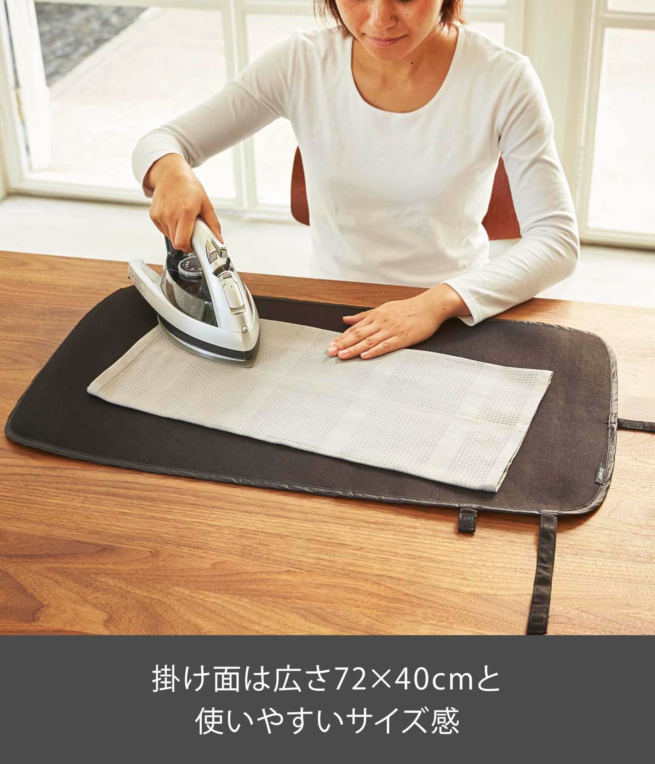 簡単に広げてアイロンマットに早変わり。アイロン掛け後は巻物のようにくるくる丸めて、面ファスナーで留めるだけの簡単収納