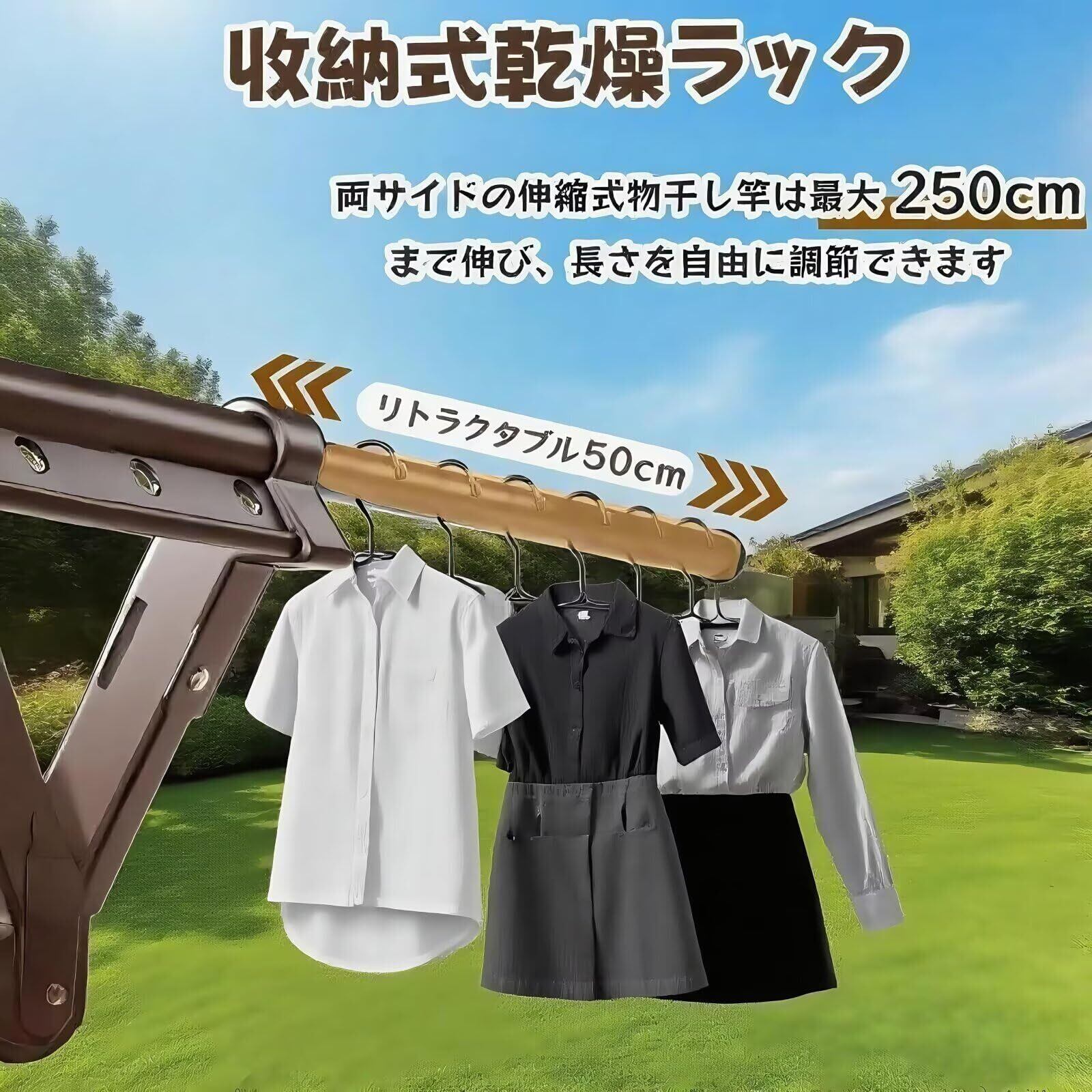 特徴:伸縮式, 耐風設計, 錆びにくい, 干しネット付き, 折り畳み可能