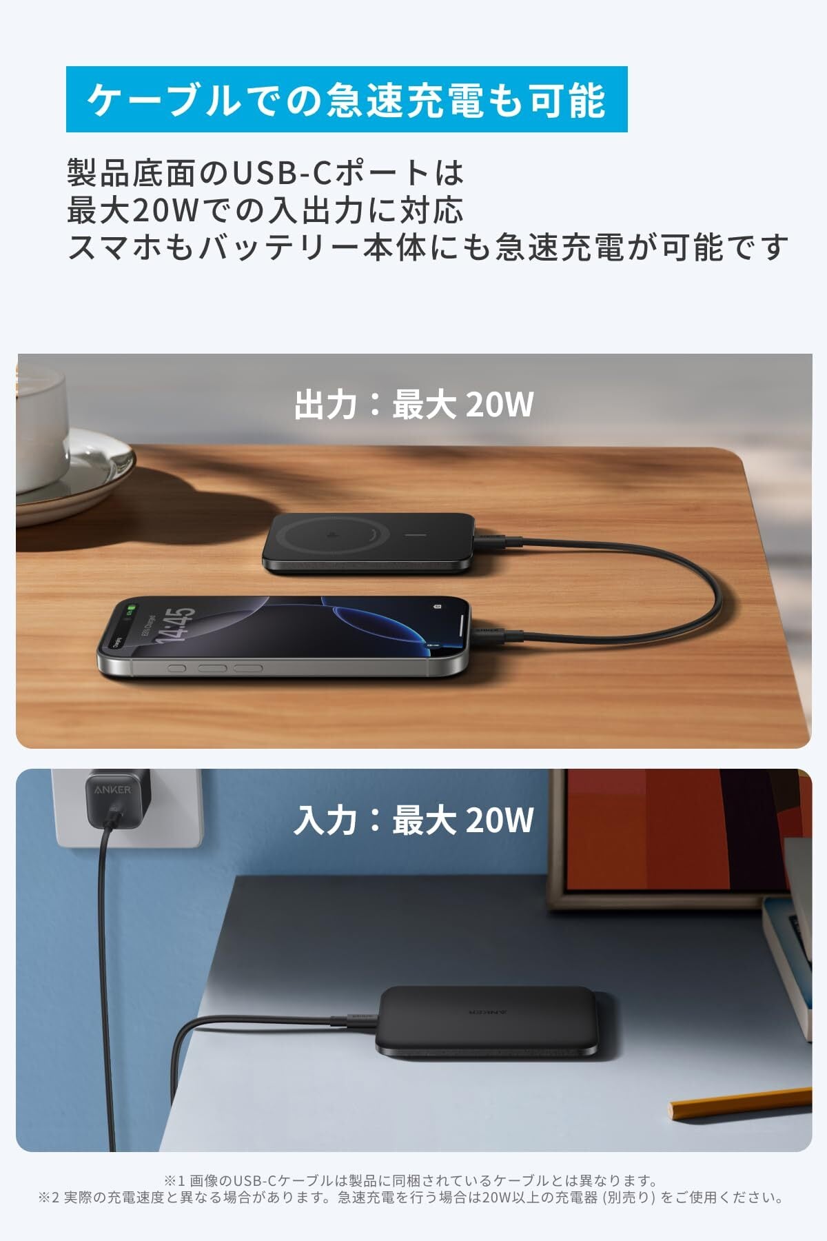 ケーブルでの急速充電も可能:製品底面のUSB-Cポートは最大20Wでの入出力に対応。スマホもバッテリー本体にも急速充電が可能です。