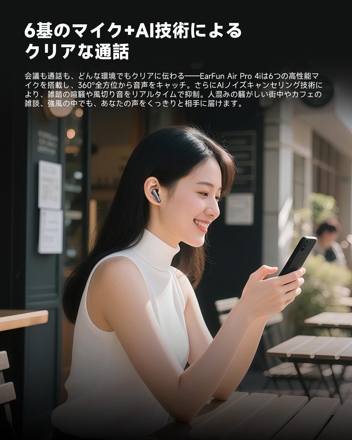 【6基のマイク+AI技術によるクリアな通話 & IP55防塵防水】会議中でも通話中でも、クリアに会話ができる――EarFun Air Pro 4iは6つの高性能マイクを搭載し、360°全方位から音声をキャッチ。AI技術で、環境ノイズを検知し、周囲の雜音を効果的に除去します。相手に声をしっかり届けるクリアな音声通話が可能。さらに、IPX55の防塵防水性能を備えており、不意の水濡れや運動中の発汗などにも安心して対応できます。注:充電ケースに防水機能はありません。