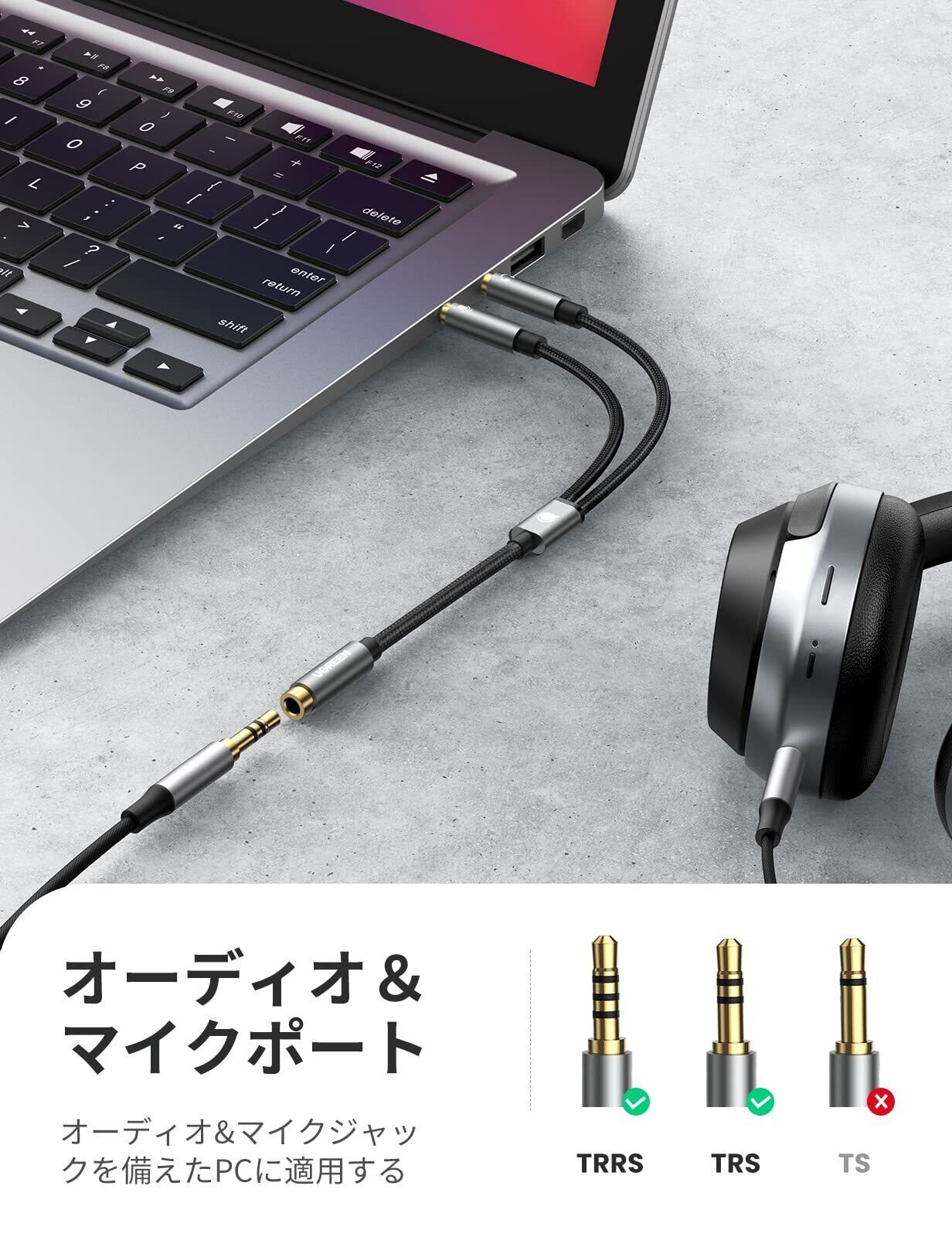 UGREEN 3.5mm 4極 3極 変換ケーブル 4極(メス) -3極(オス*2)マイク 3.5mm 変換ケーブル ステレオ Hi-Fi音質再生 多重シールド 高耐久性ナイロン編み 24K金メッキコネクタ マイク入力・ヘッドホン出力 プラグStep-Down設計 20CM