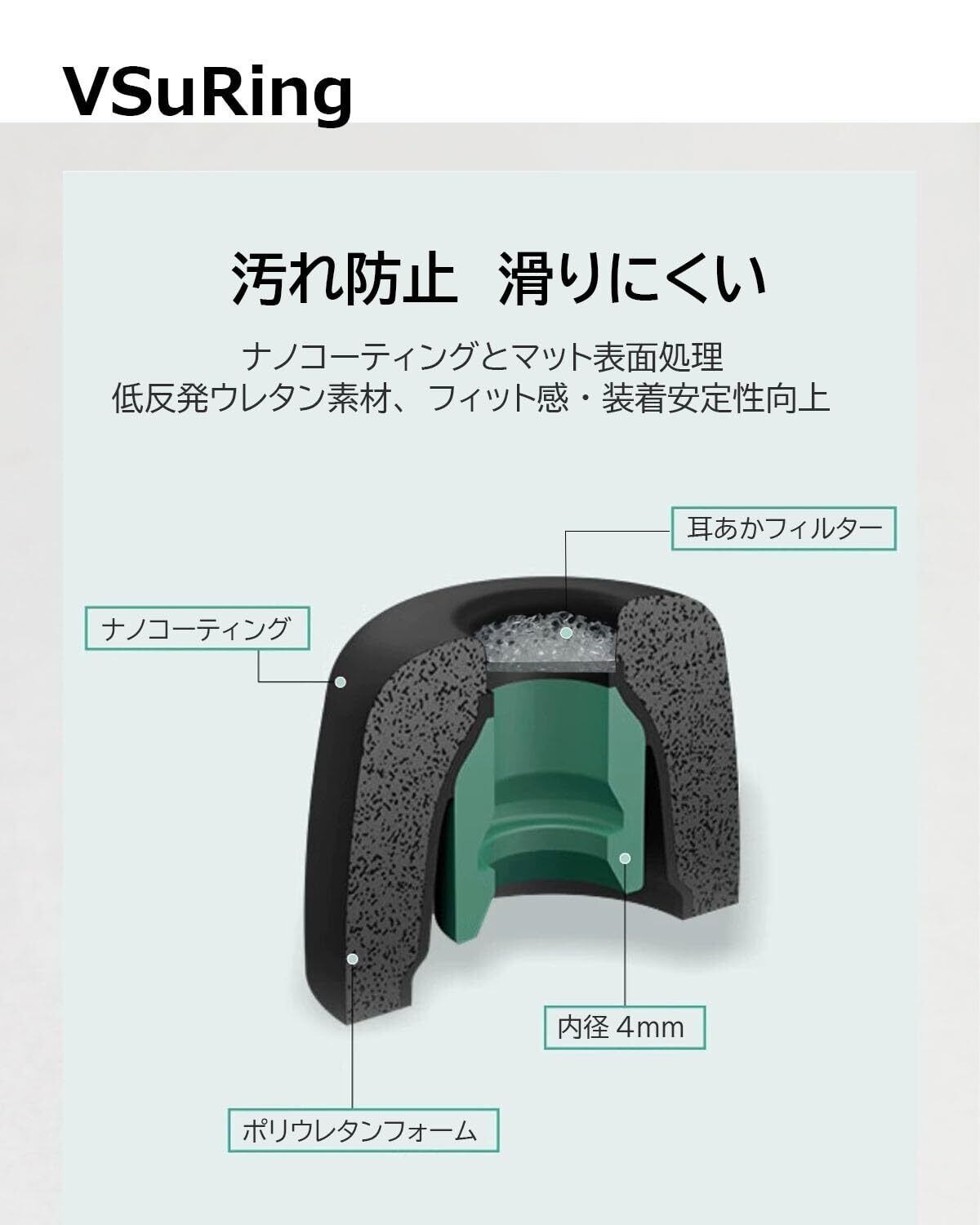 【優れた遮音性と着用感】VSuRingのイヤーピースは、耳垢ガードフィルターが付いており、外部の音を効果的に遮断します。これにより、集中して楽しむべき音楽や通話を邪魔されることはありません。さらに、柔らかい素材が長時間のリスニングでも疲れを感じさせません。
