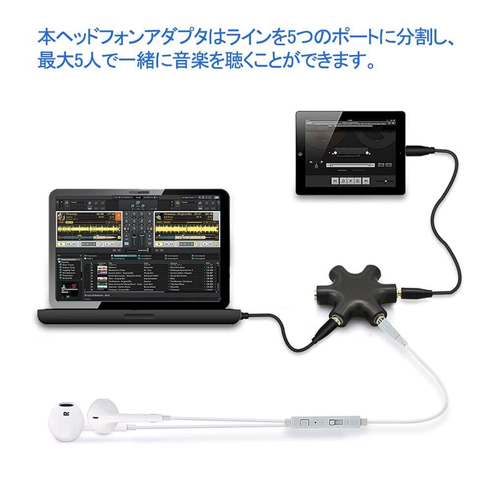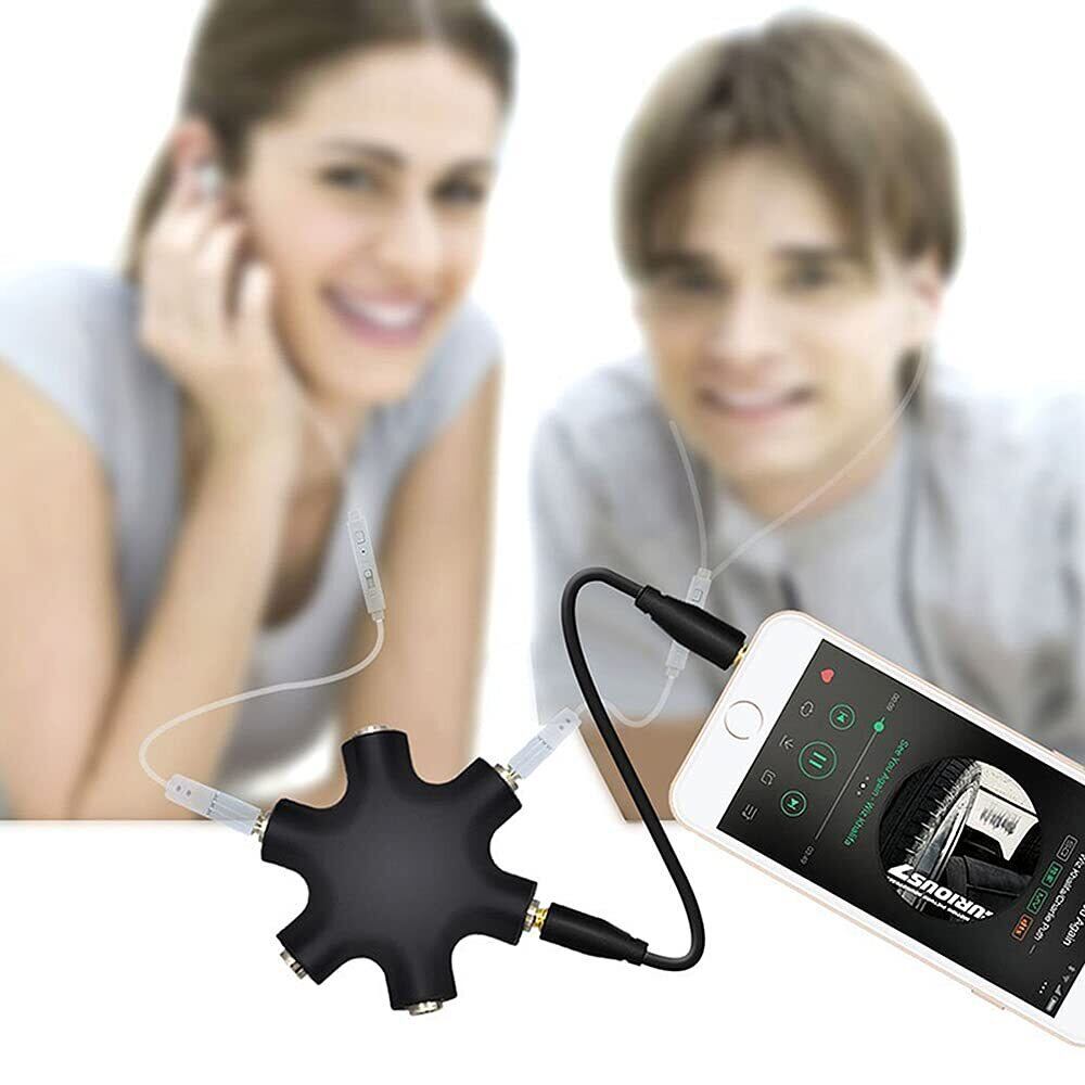 マルチイヤホンスプリッター 3.5mm ステレオイヤホンプラグ 5ウェイ 6ポート イヤフォンジャック分配器 メス接続器 ヘッドフォンアダプタ オーディオスプリッター コネクター 3.5mmステレオケーブル (ブラック)