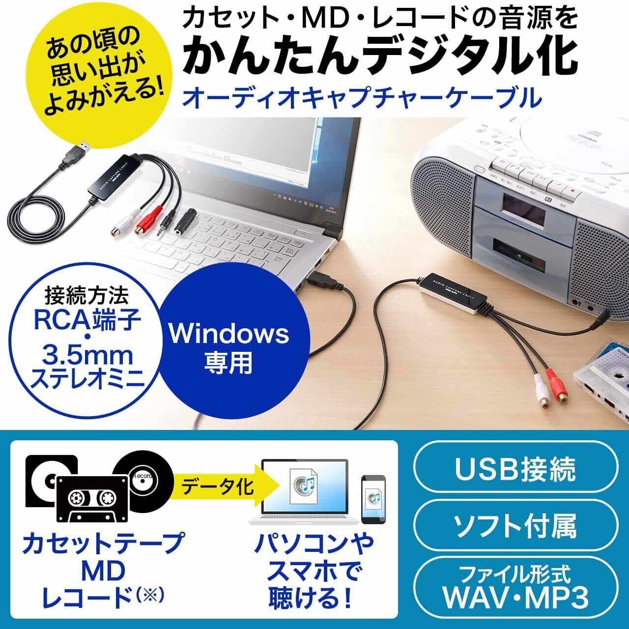 【在庫限り】サンワダイレクト USBオーディオキャプチャー アナログ音声デジタル化 カセットテープ/MD/レコード Windows対応 ソフト付属 400-MEDI017