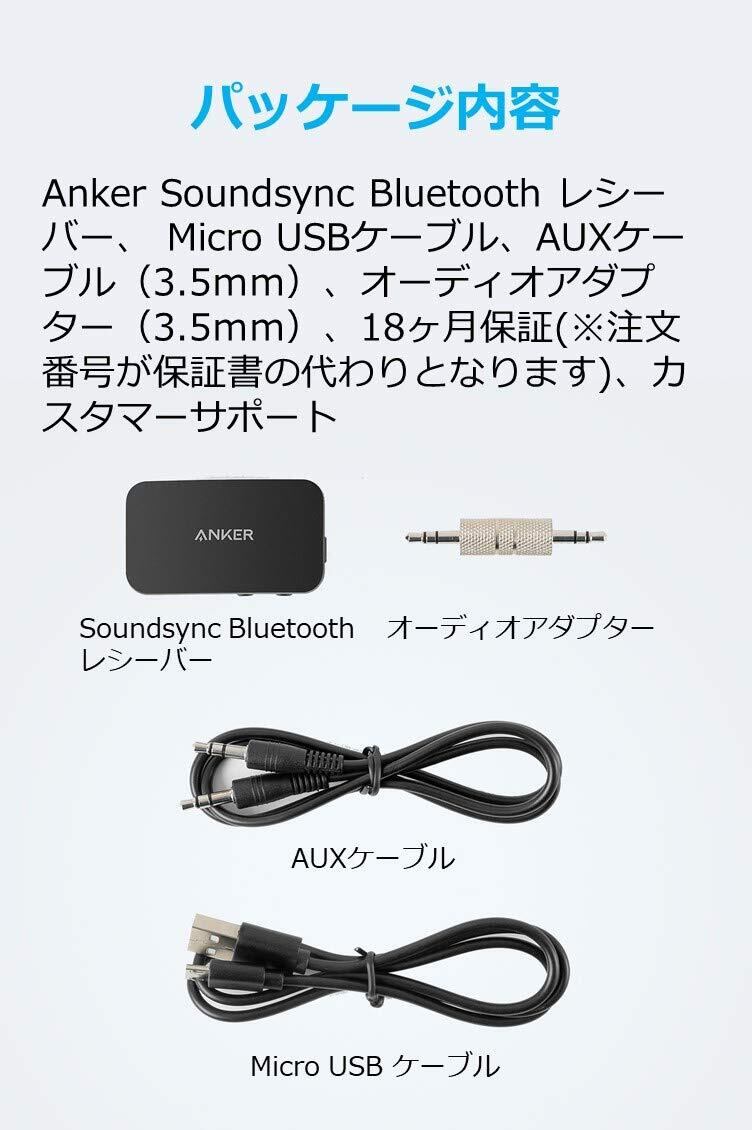 パッケージ内容:Anker Soundsync Bluetoothレシーバー、Micro USBケーブル、AUXケーブル (3.5mm)、オーディオアダプター (3.5mm)、取扱説明書、カスタマーサポート