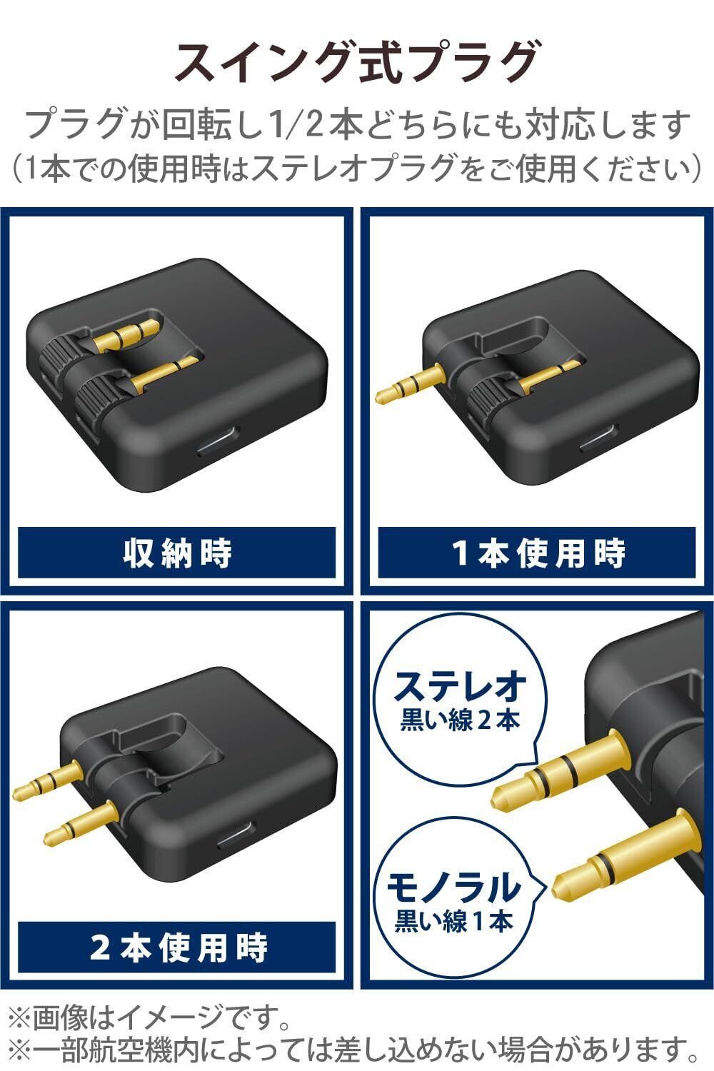 ■2本のφ3.5mmプラグがそれぞれ回転するスイング式で、2本/1本どちらのプラグにも対応しています。航空機内のφ3.5mmデュアルジャックにもテレビのφ3.5mmヘッドホンジャックにも対応可能です。