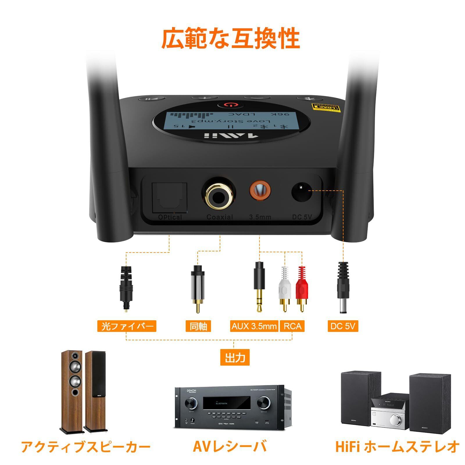 特徴 LDAC Hi-Res, aptX HD/LL, オーディオファイルDAC, 長距離伝送, 音量制御とLCD画面表示
