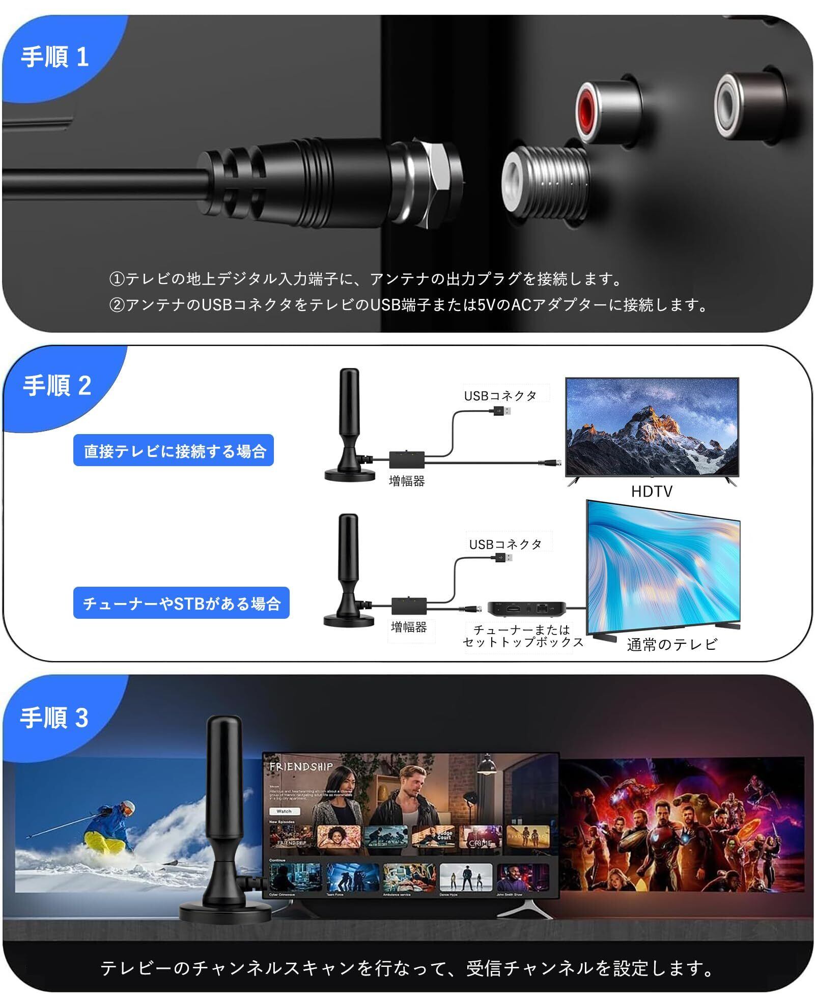 【工事不要&360度全方位受信】 配線工事が不要で、地デジ放送アンテナを小型テレビに接続するだけですぐに使用できます。車泊やキャンピングなどにおすすめ!ブースター内蔵で360°全方位から電波を受信できる他、安定した受信が可能で、快適に地デジ放送を楽しめます。強電界・中電界地域はもちろん、弱電界地域や電波の不安定な室内でも安定した受信が可能です。4Kテレビおよび1080Pの高解像度の映像を高精細に映し出すだけでなく、ブロックノイズを低減してきれいな画質を楽しめます。