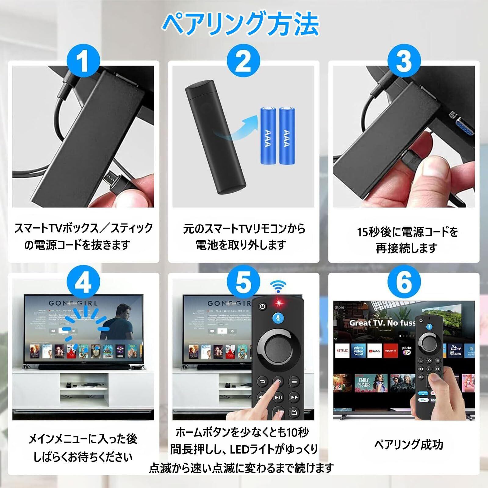 【ペアリング手順(元リモコンがある場合)】1、新しいリモコンの「ホーム」ボタンを10秒以上長押し → LEDがゆっくり点滅から速い点滅に変化し、ペアリング待機状態に。2、元のリモコンで〔設定〕>〔コントローラーとBluetoothデバイス〕>〔TVリモコン〕>〔新しいリモコンを追加〕を選択。3、画面に表示された新しいリモコンを選択 → ペアリング完了メッセージが表示されます。新しいAlexa対応音声認識リモコンの使用を開始できます。
