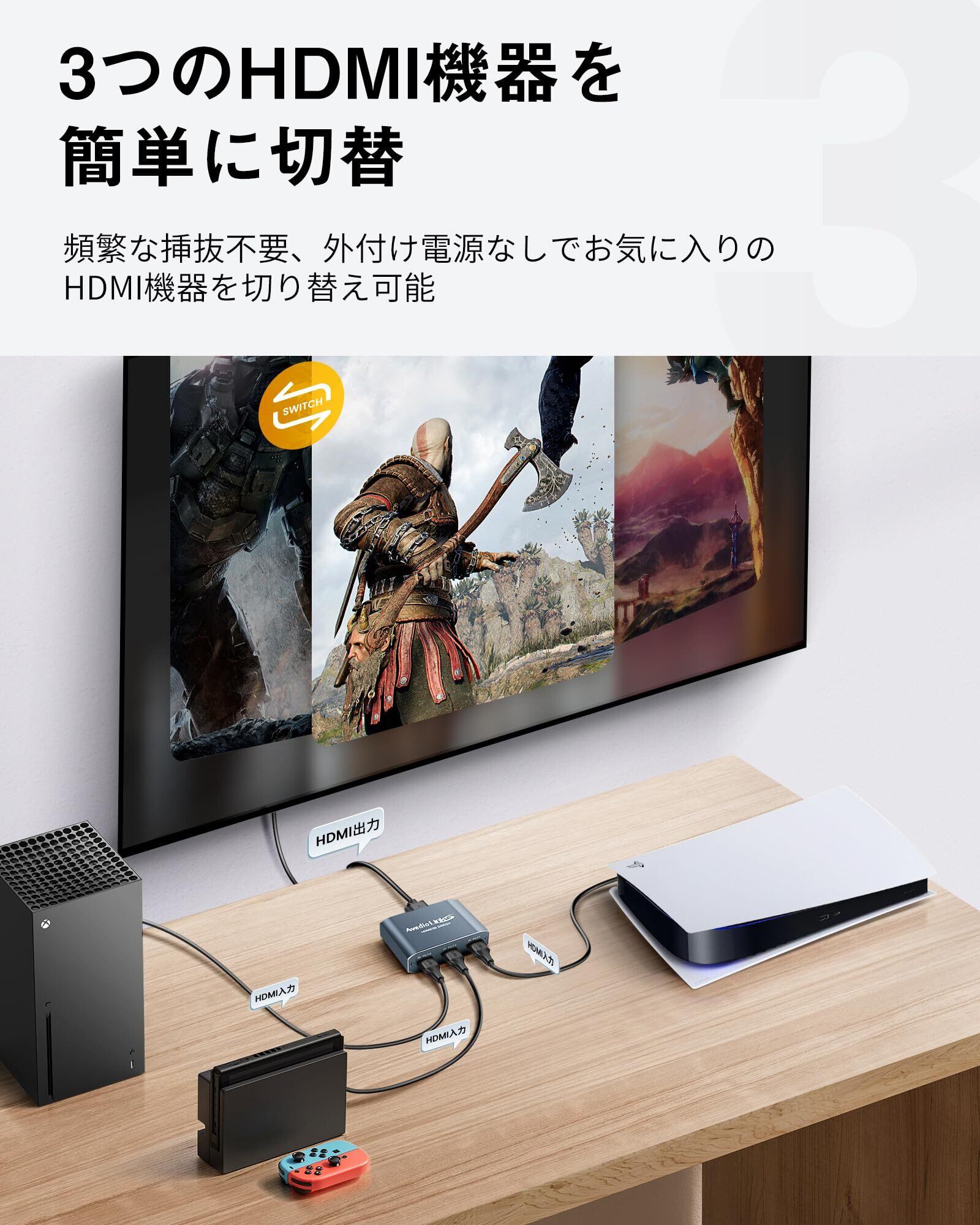 HDMI 切替器 3入力1出力 - avedio links 4k 60hz HDMI 切り替え器、3つの異なるHDMIソースから1つのHDMIディスプレイにビデオとオーディオを簡単にストリーミングします。最も重要なのは、ラグ、フラッシュ、解像度の低下はありません!頻繁なプラグ抜きを避けるため、簡単にお気に入りの入力デバイスを切り替えることができます。